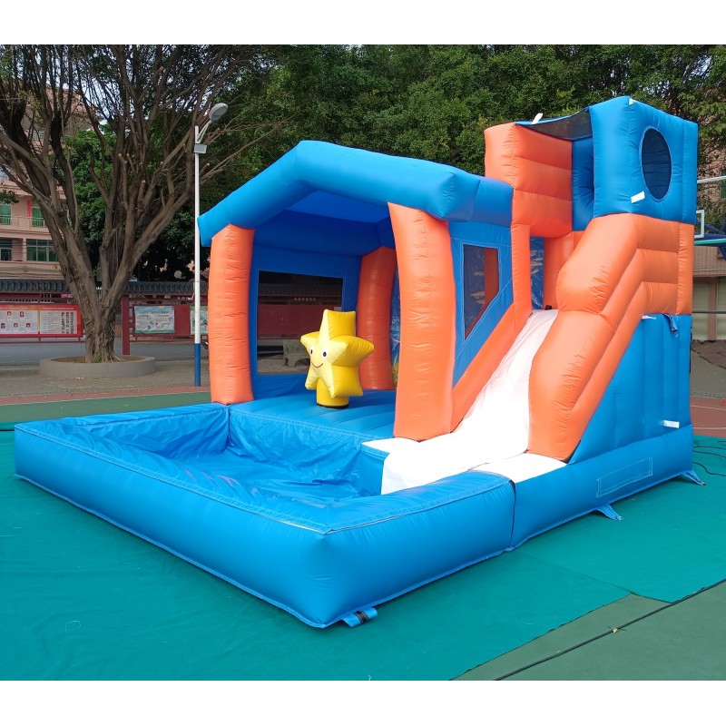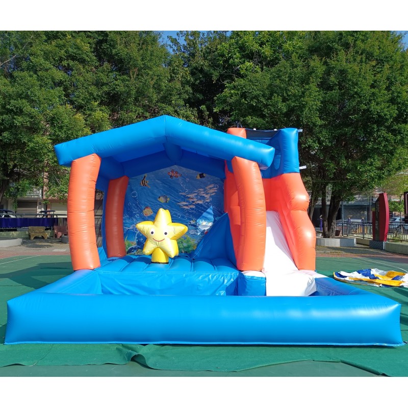 Castillo acuático pequeño muy colorido con zona de saltos, estrella de mar inflable en la zona de rebote, tobogán acuático y piscina hermética.