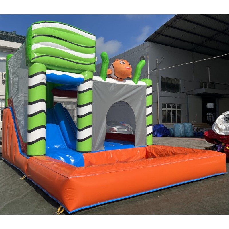 Castillo hinchable acuático con zona de rebote, tobogán y piscina.