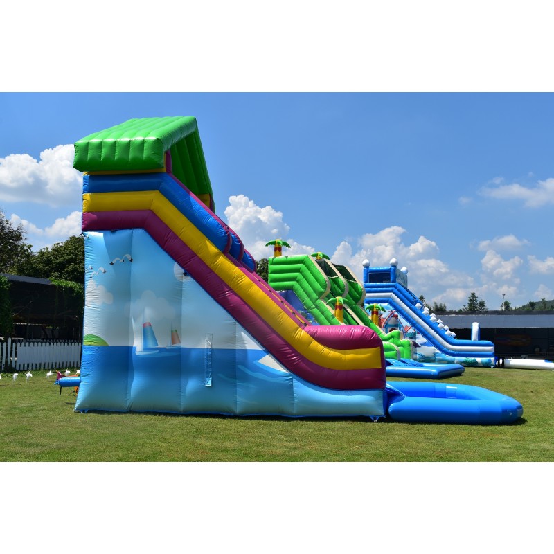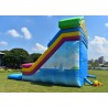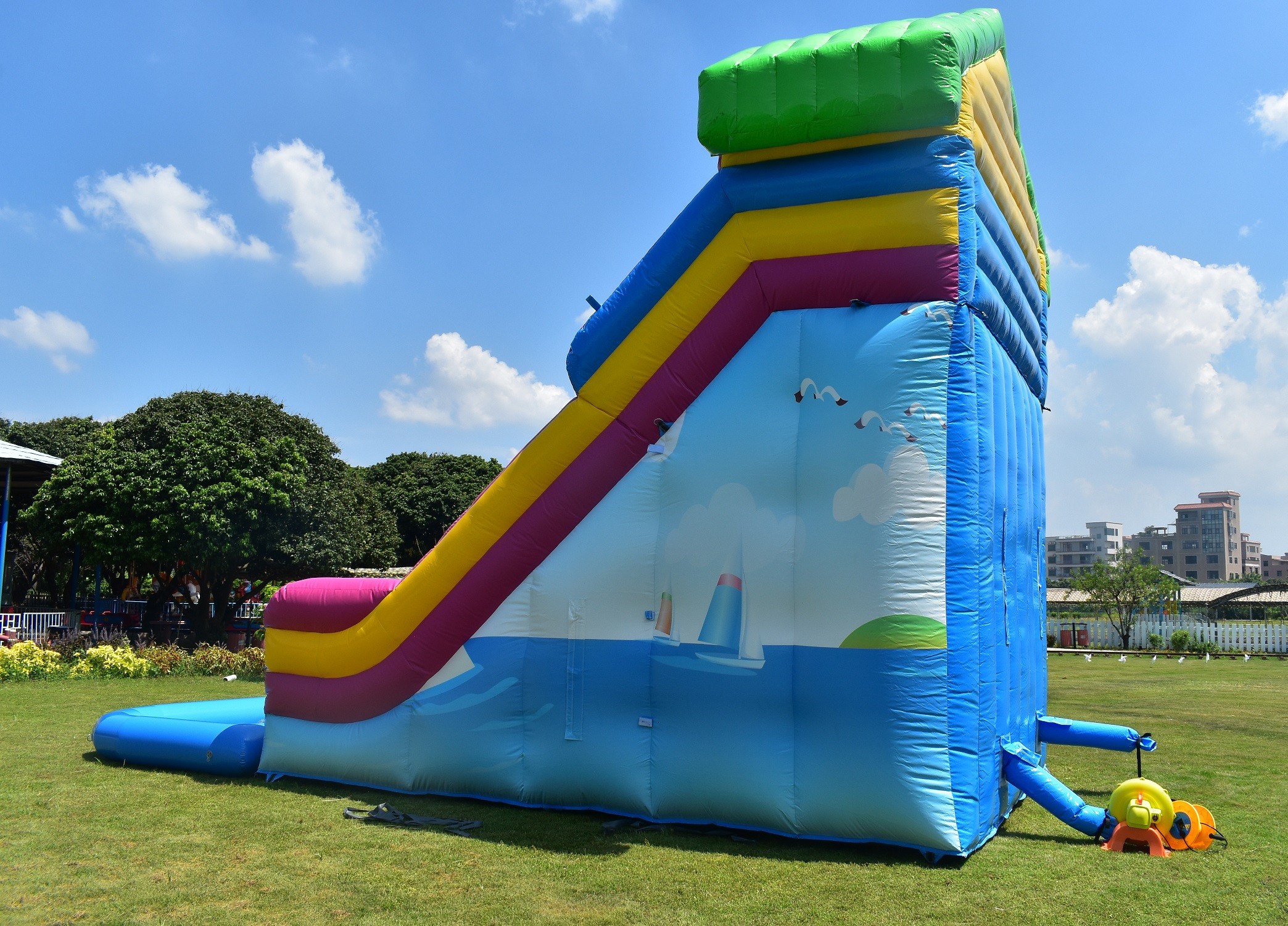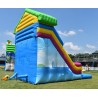 Tobogán hinchable acuático muy colorido con dibujos serigrafiados de gran calidad sobre el PVC en las paredes laterales del hinchable.