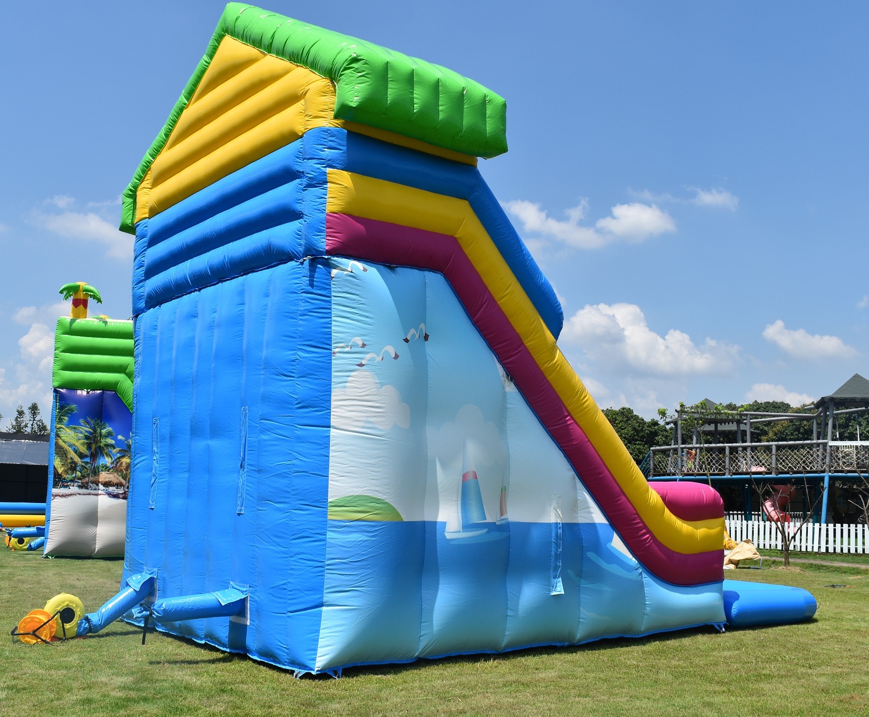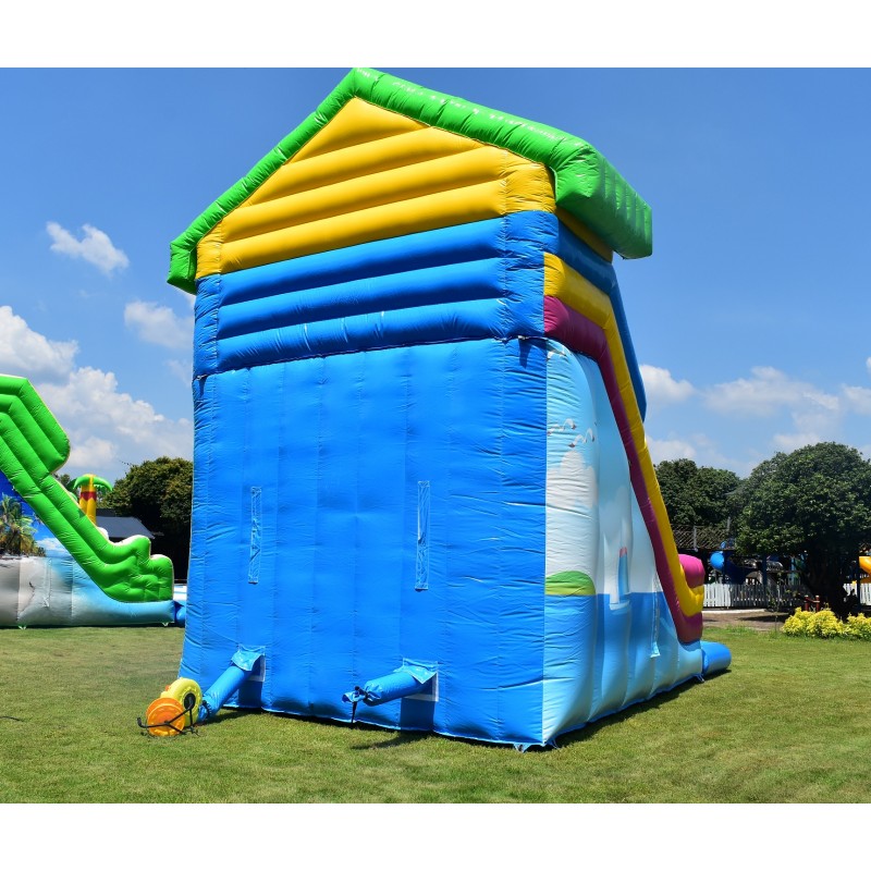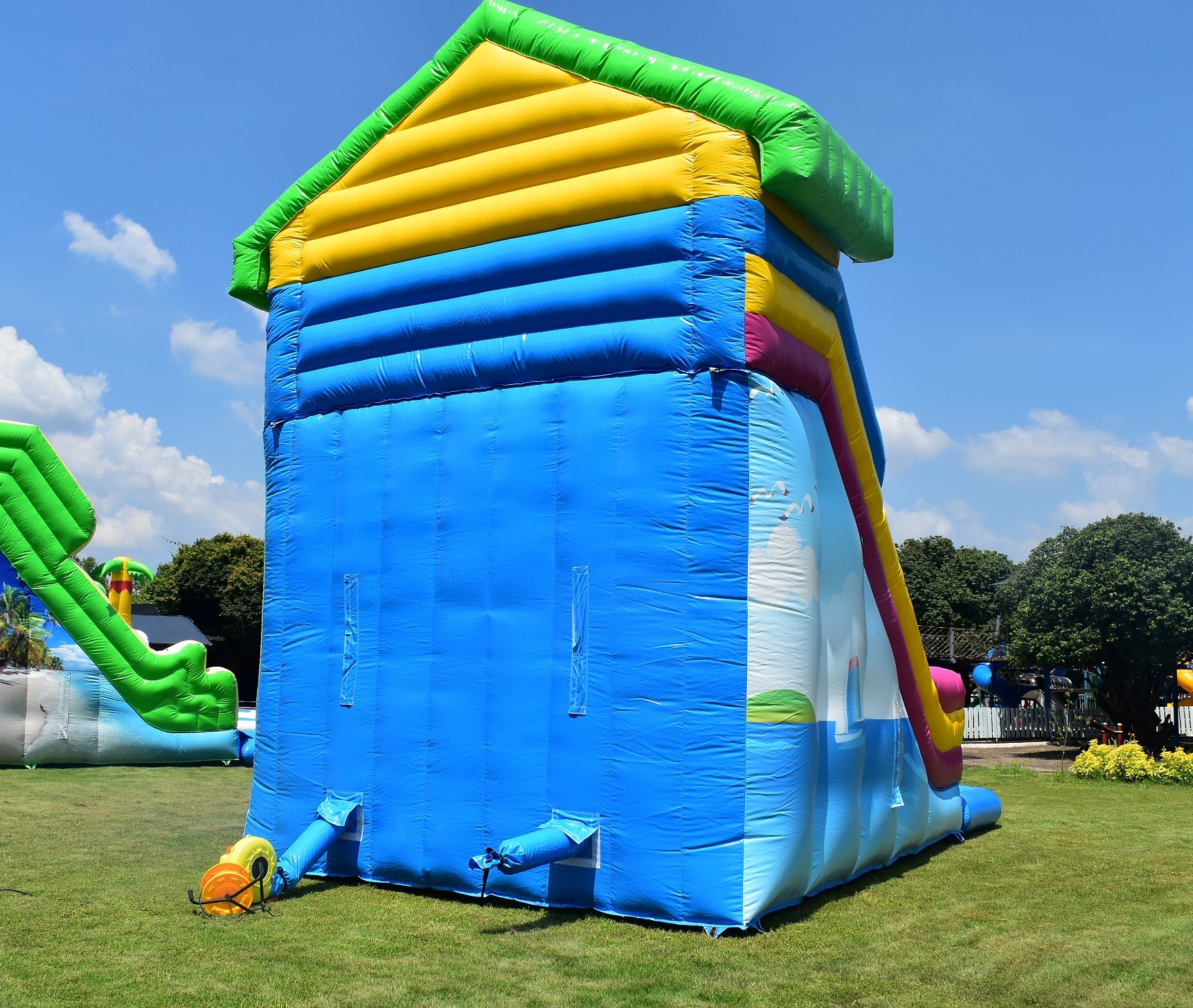Material: lona de PVC 0.55mm, a prueba de agua y funciones ignífugas. (No usamos material de baja calidad como el tejido Oxford comúnmente utilizado en castillos de uso particular de pequeño tamaño).Material en la piscina hermética PVC 0.60mm termosellado.