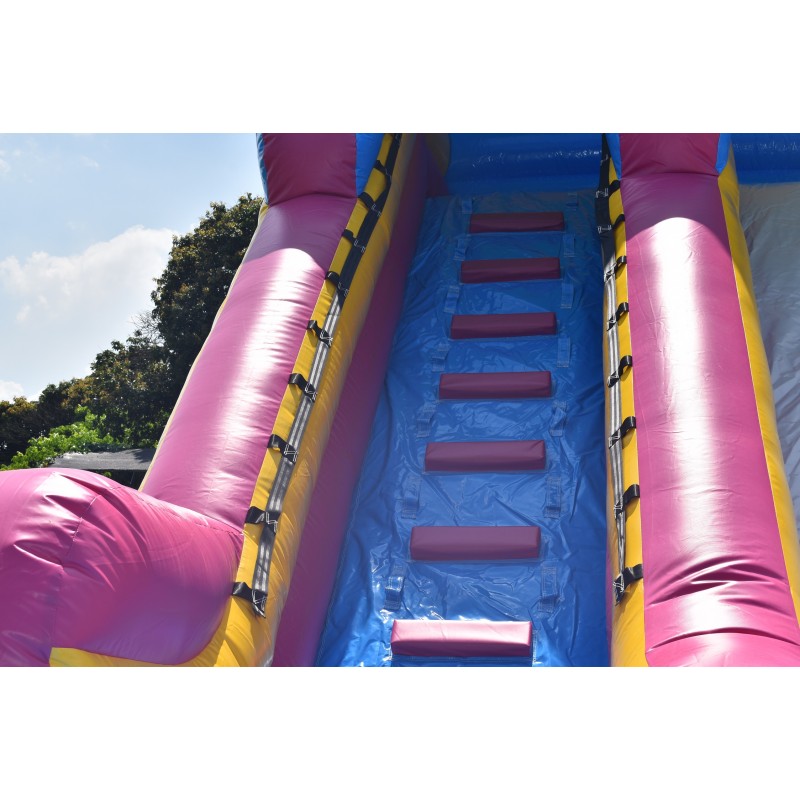 Como medida de seguridad toda la zona alta se encuentra cerrada y techada, la zona alta del castillo tiene 180 cm de altura aprox, la altura del vallado lateral en la parte alta tiene una medida de 115 cm de altura con red de protección para que las personas más altas permanezcan tumbadas al deslizarse y ascender la escalera.La fabricación de este tobogán se ha realizado siguiendo los estandartes de la nueva normativa EN14960-1:2019.