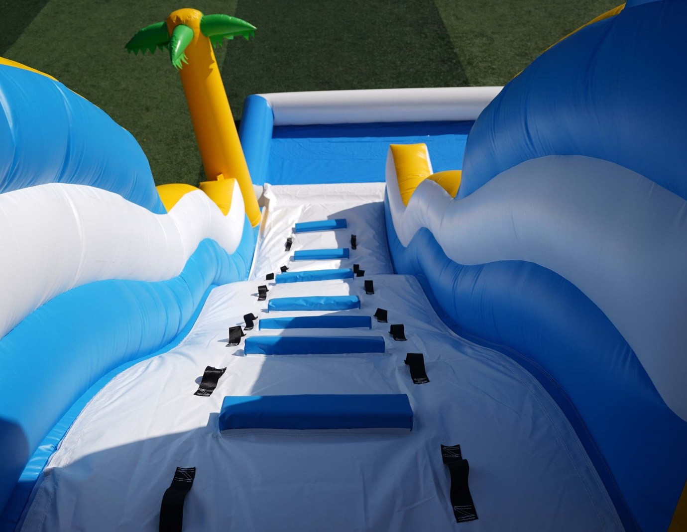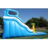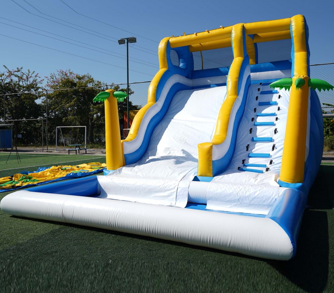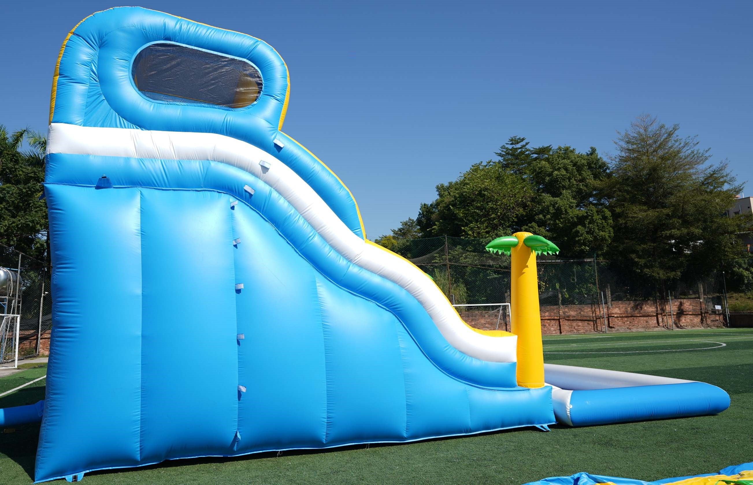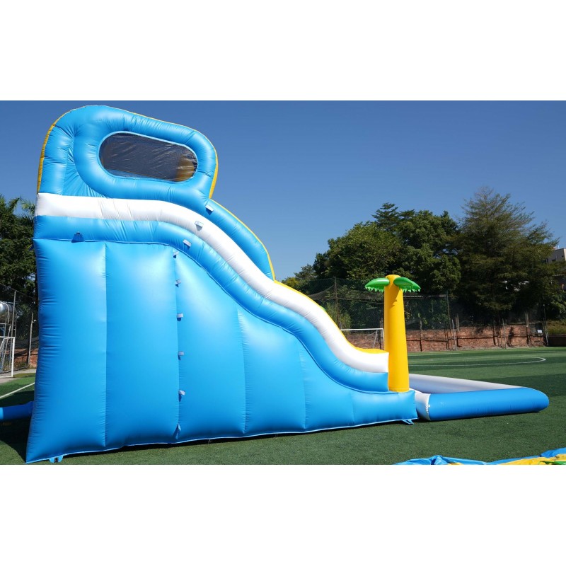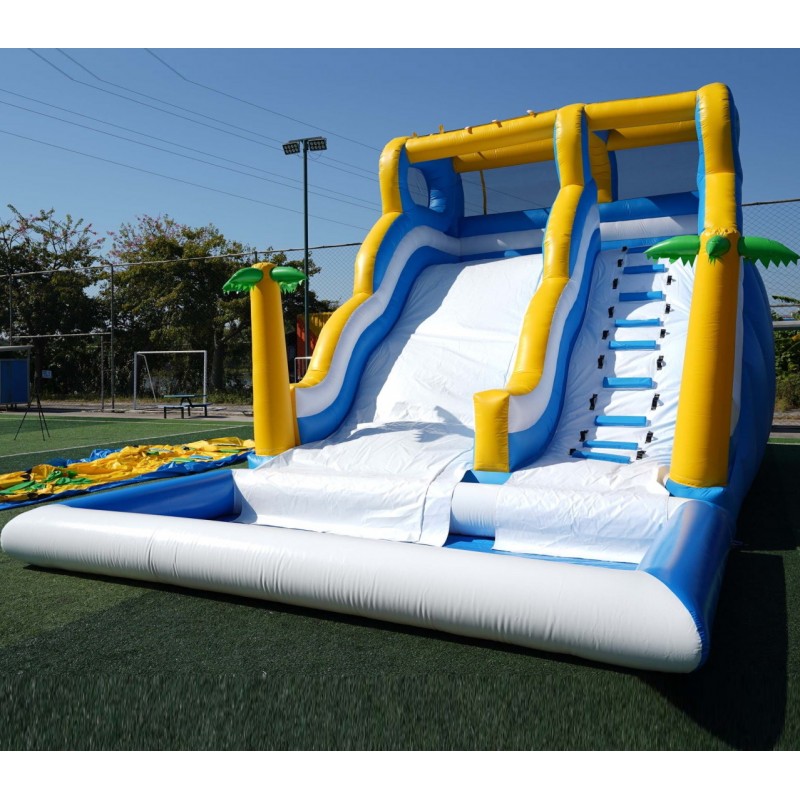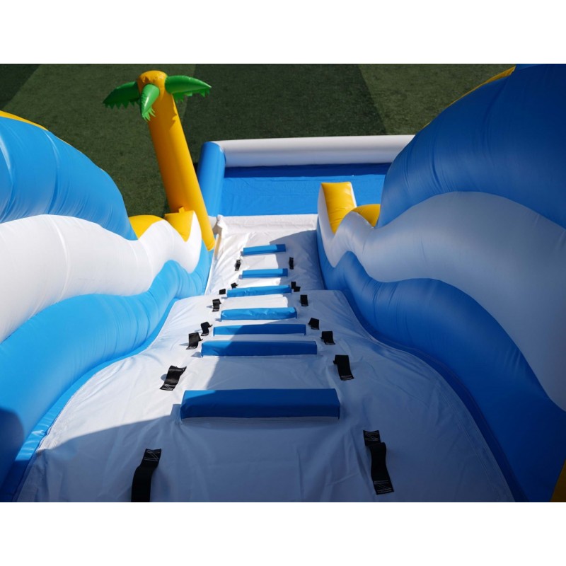 Tobogán hinchable acuático con palmeras, piscina y tobogan deslizador ondulado.