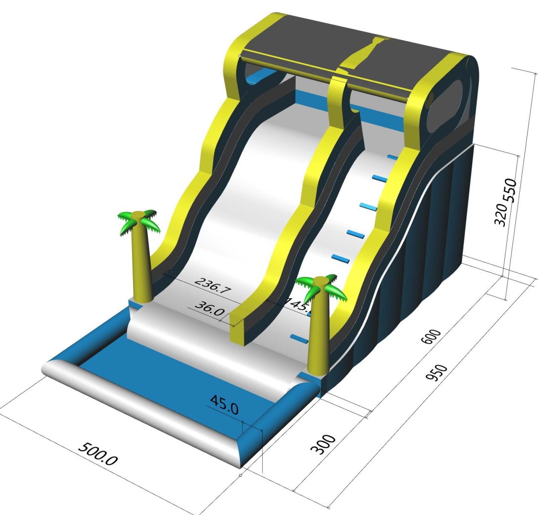 - 1 x Tobogán hinchable D25, medidas 9,5/10,5 x 5 x 5.5 metros.