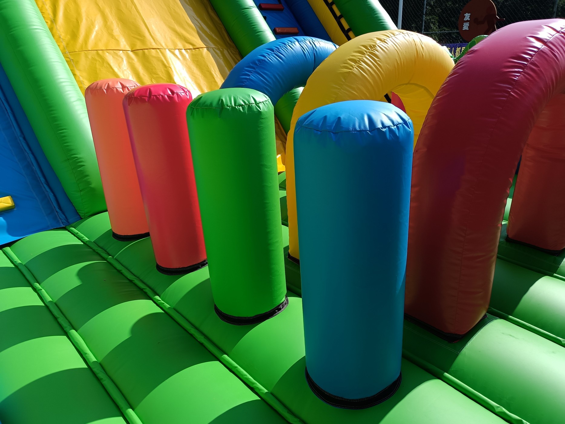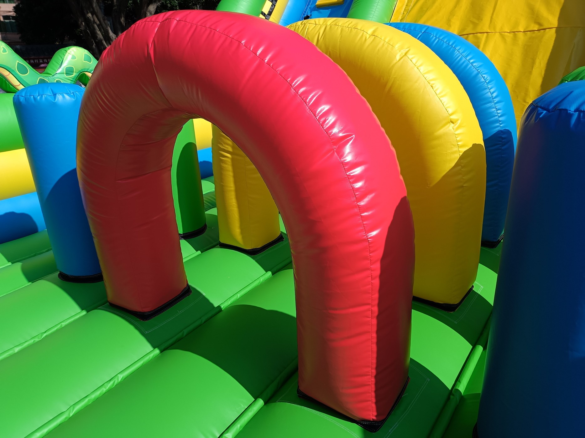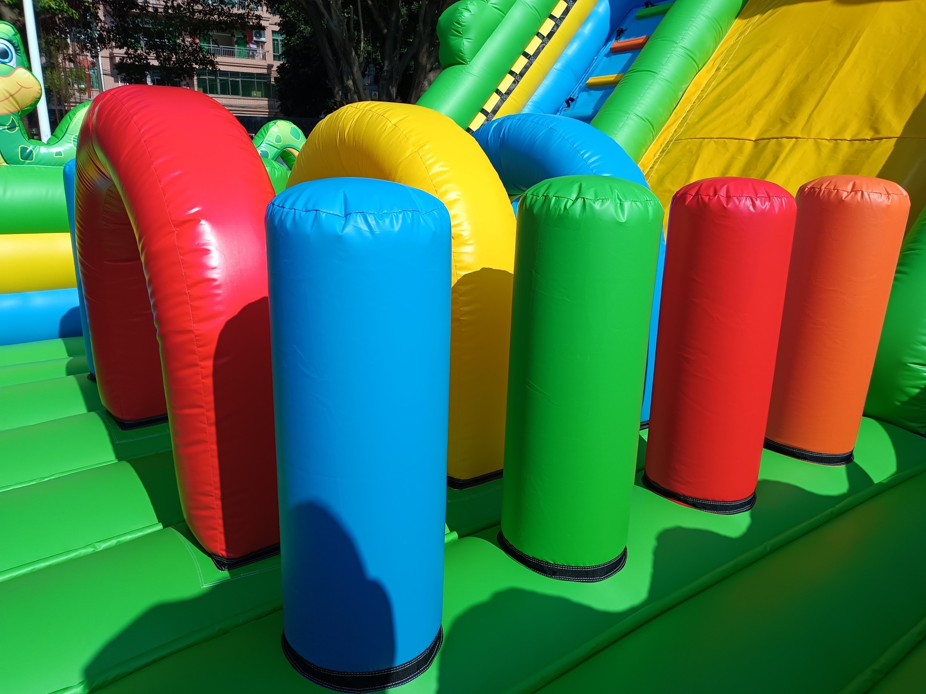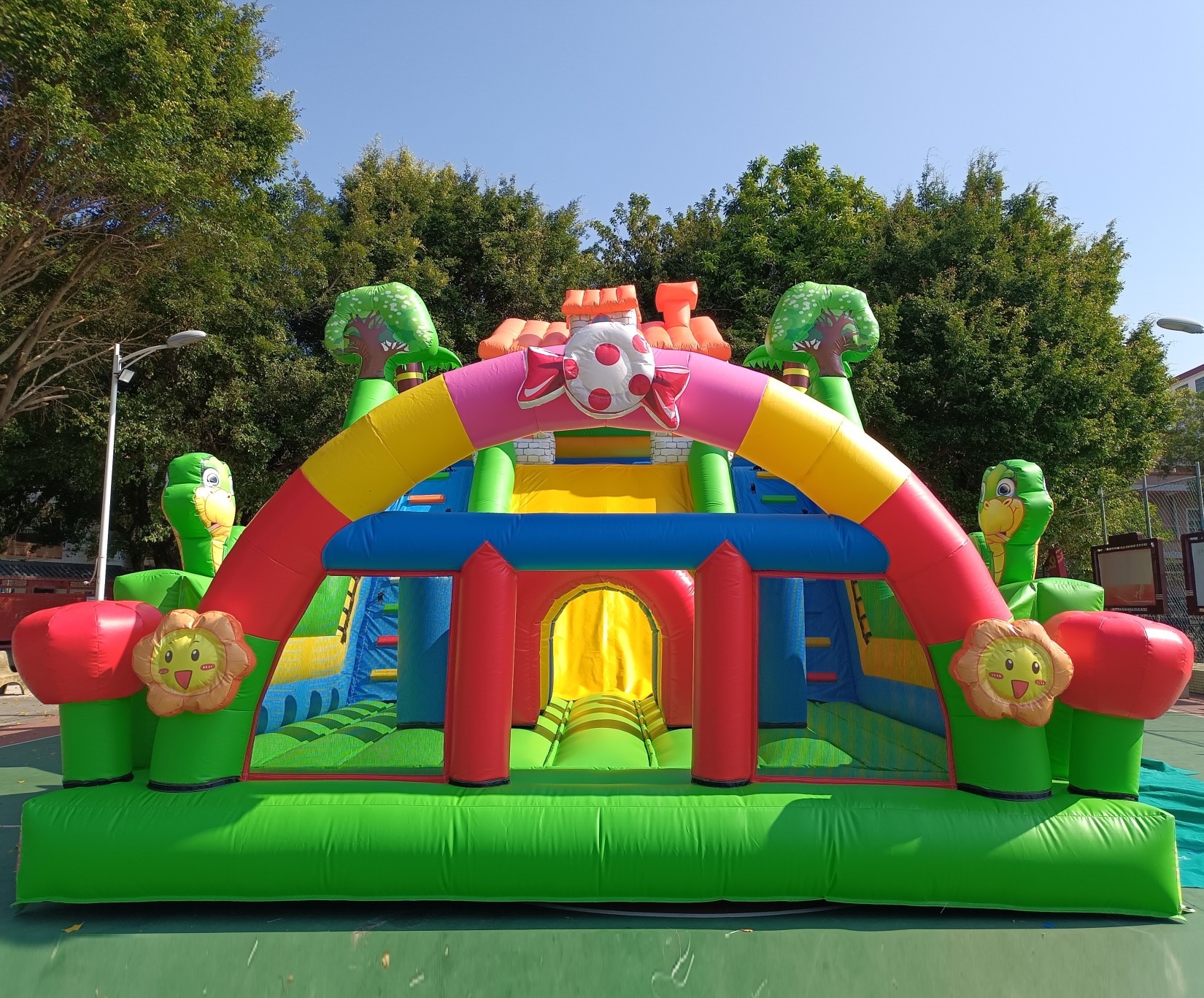 Material: PVC 0.55mm, a prueba de agua y funciones ignífugas. (No usamos material de baja calidad como el tejido Oxford comúnmente utilizado en castillos de uso particular de pequeño tamaño).