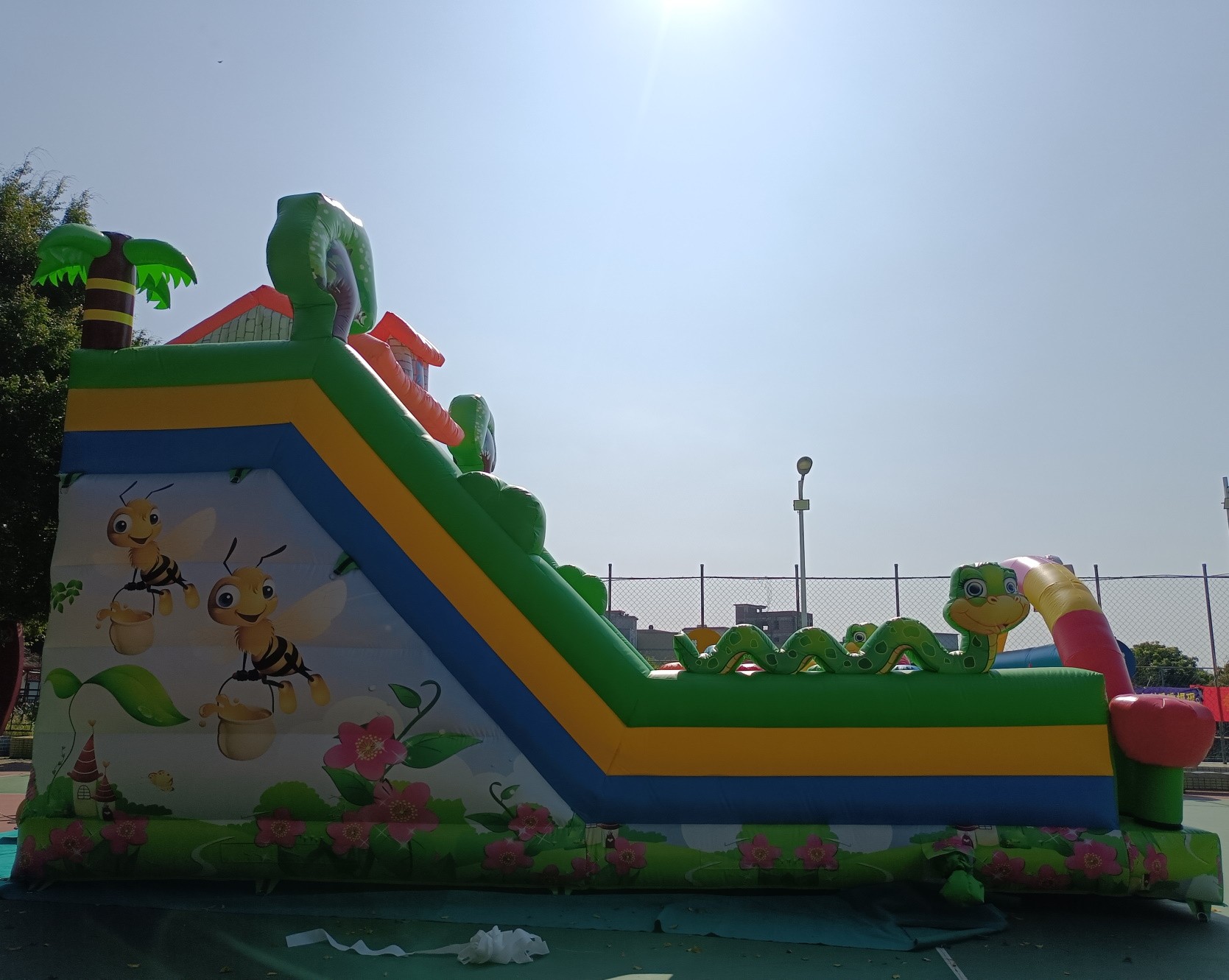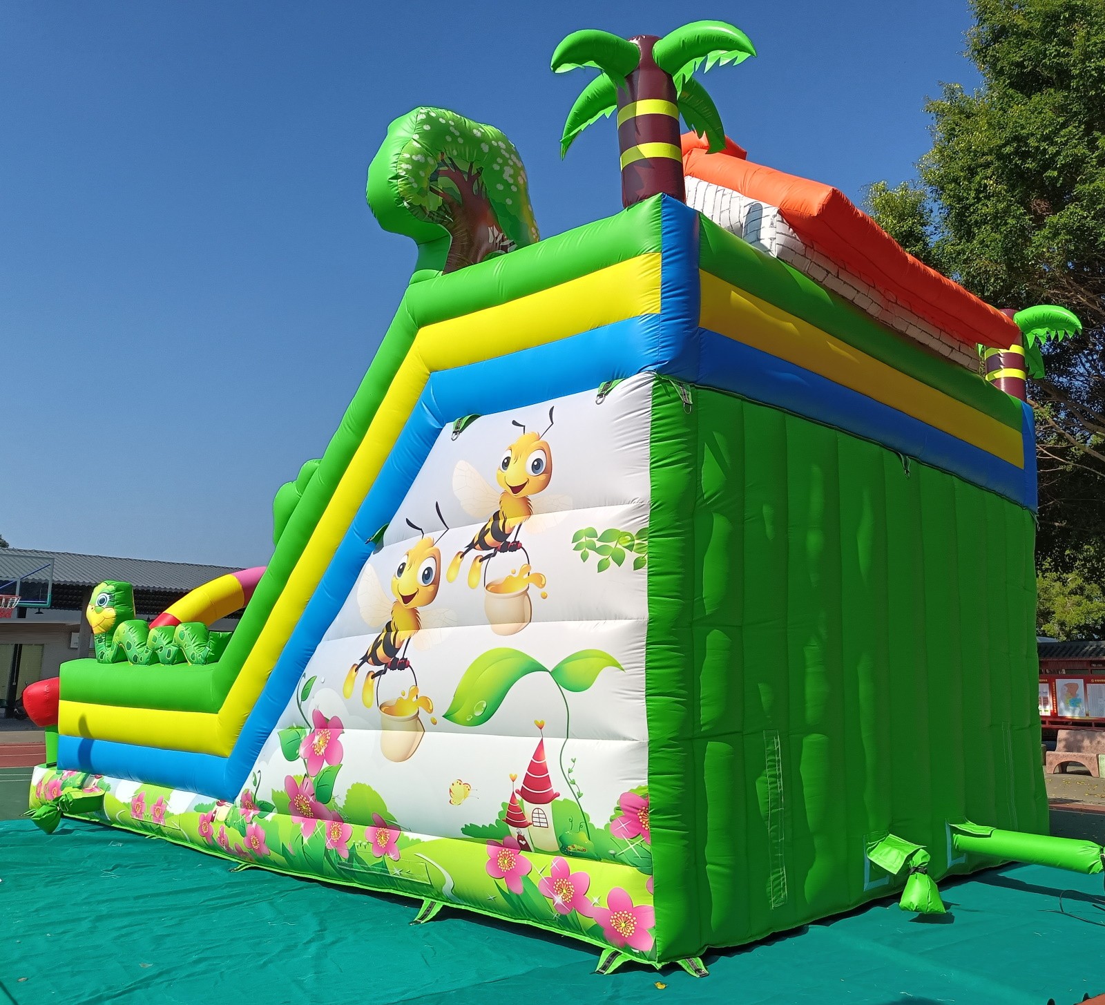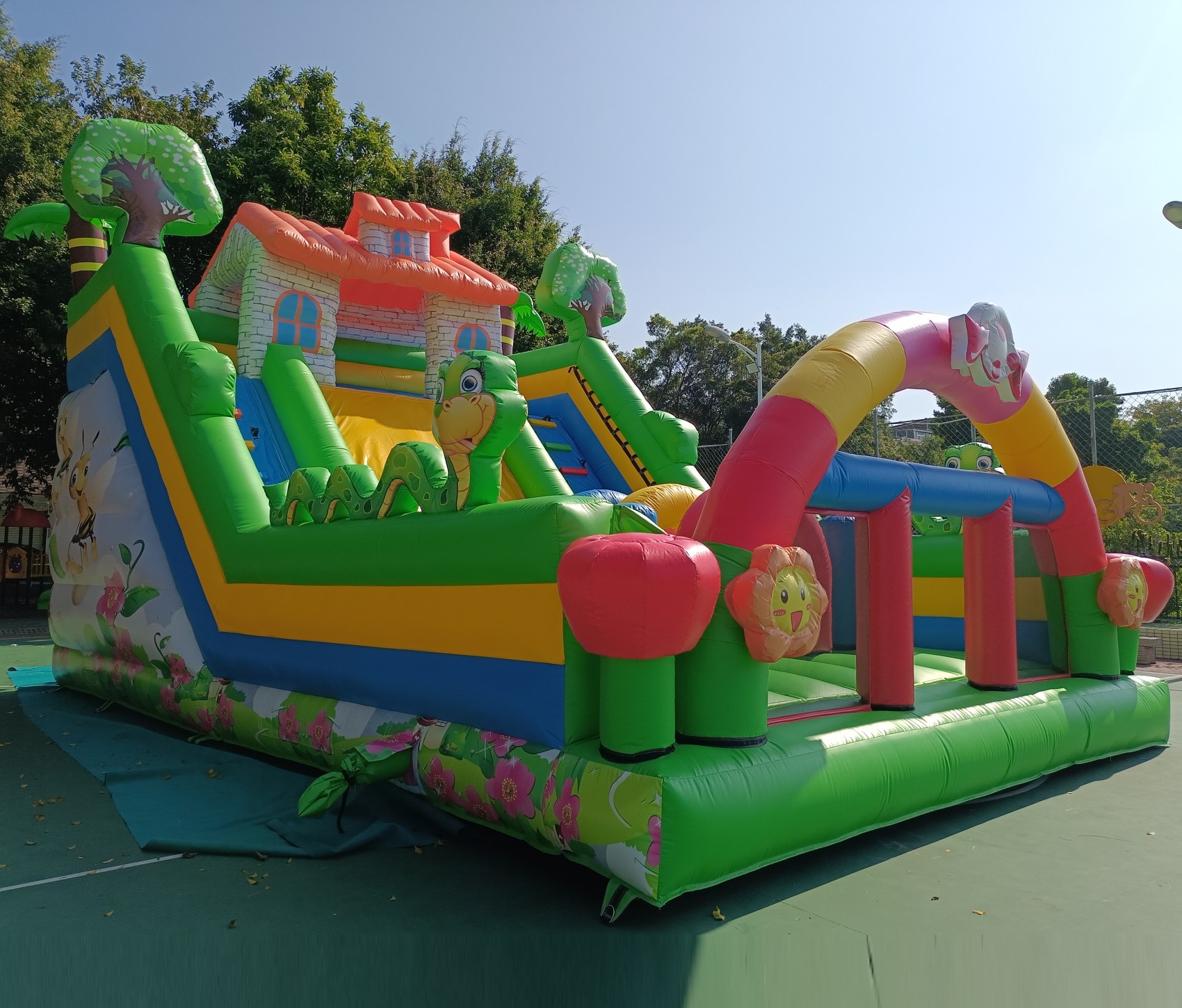El hinchable cuenta con una serigrafía de alta calidad con dibujos de la primavera, abejas, serpientes, árboles, flores impresos sobre el PVC.