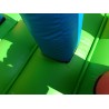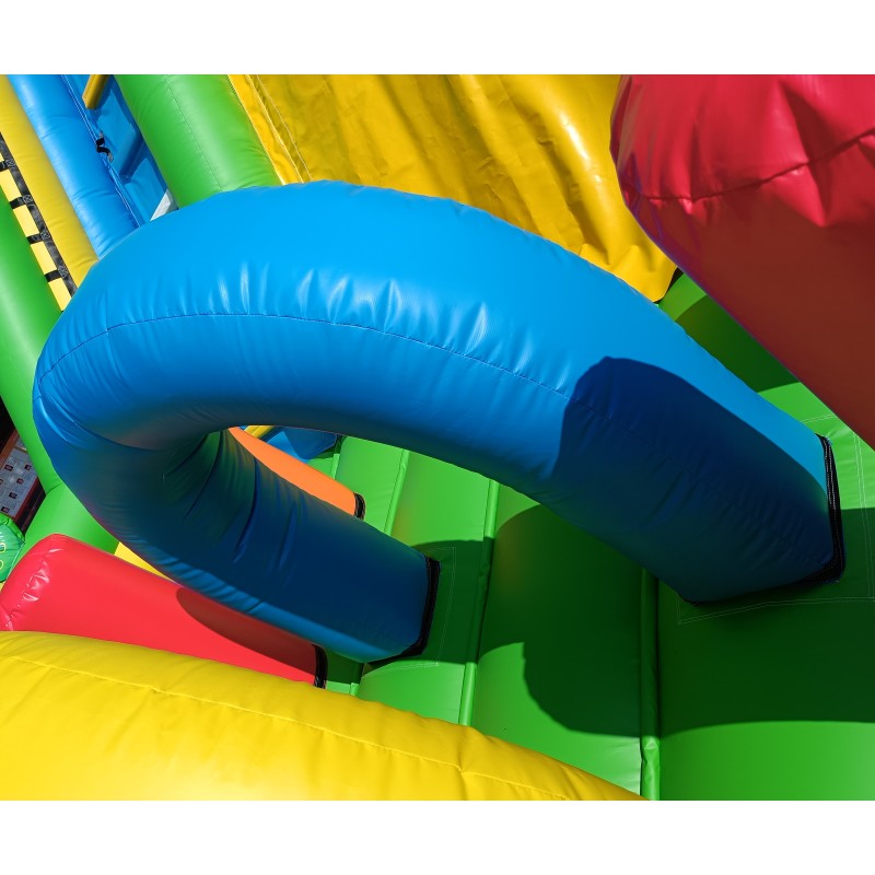 El tobogán está fabricado con material de PVC con tratamiento deslizante que favorece el deslizamiento de los niños. La funda del tobogán y de la escalera es desmontable con velcro, esto favorece las labores de mantenimiento y limpieza del hinchable.