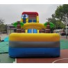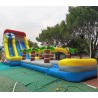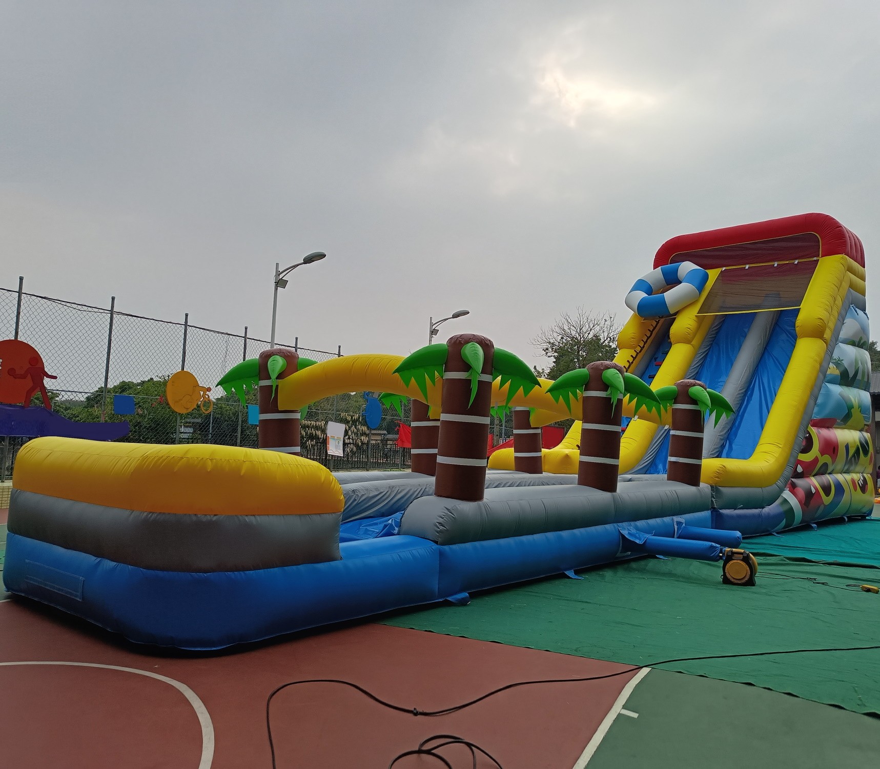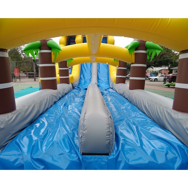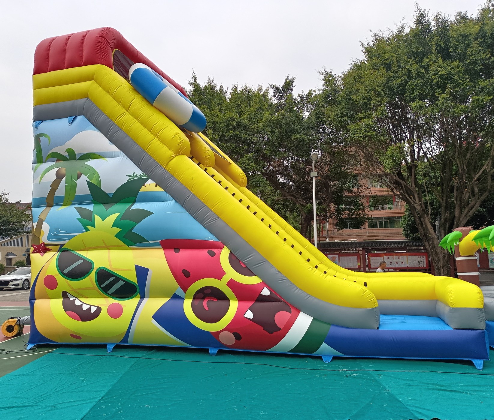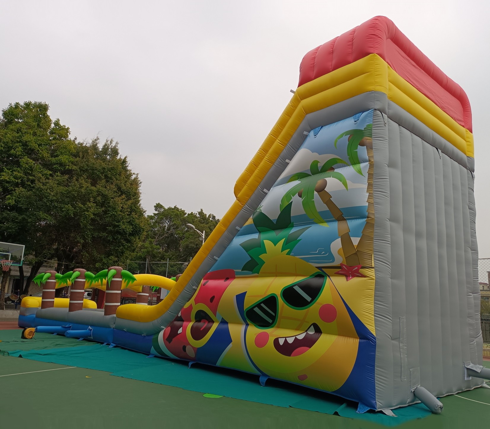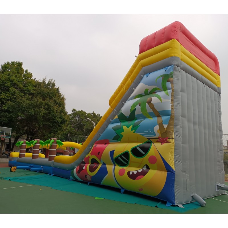 Gran tobogán hinchable con doble deslizador que transcurre por debajo de palmeras. El tobogán tiene una hermosa serigrafía a todo color en los laterales con dibujos de frutas animadas y un flotador hinchable sobre las escaleras.