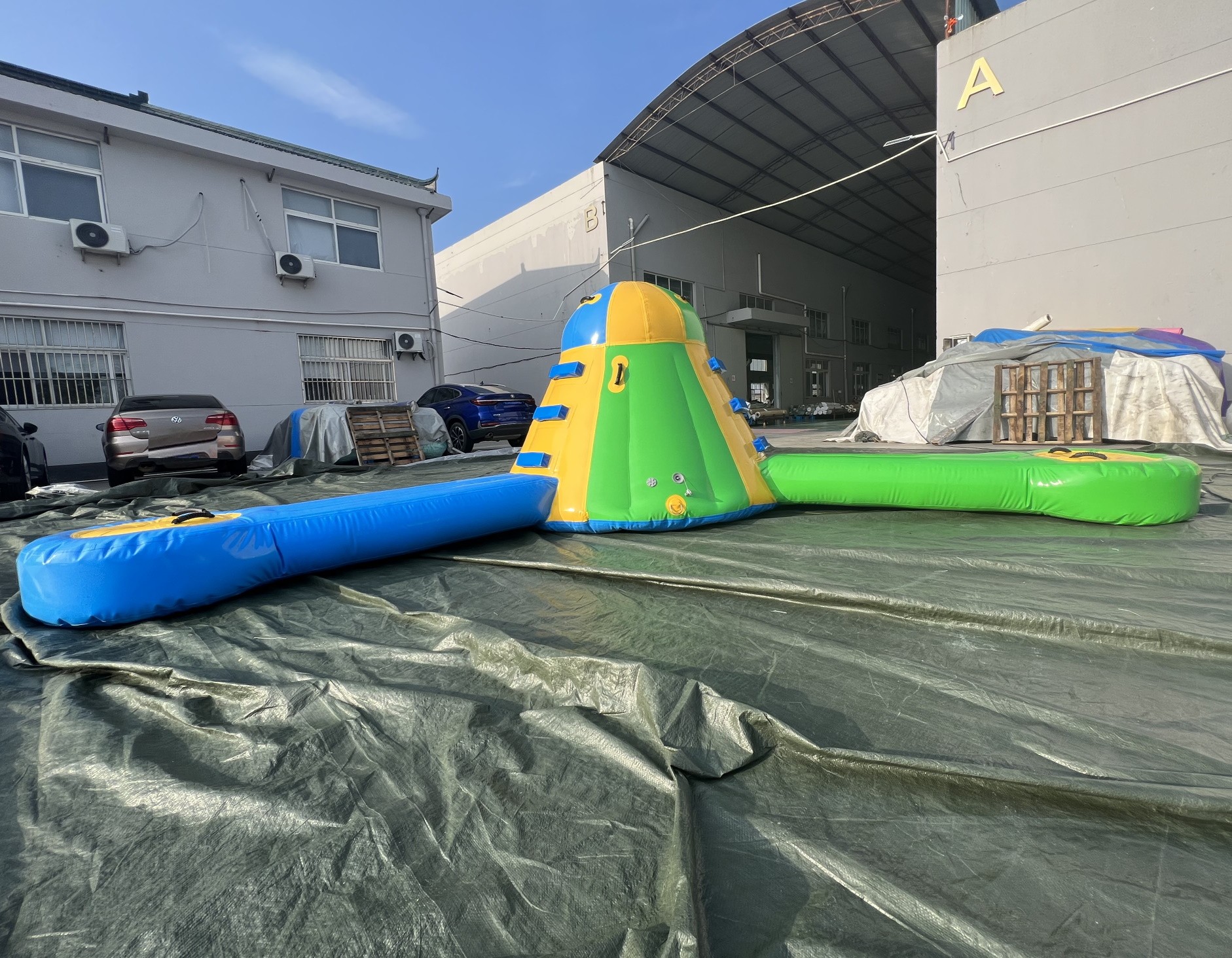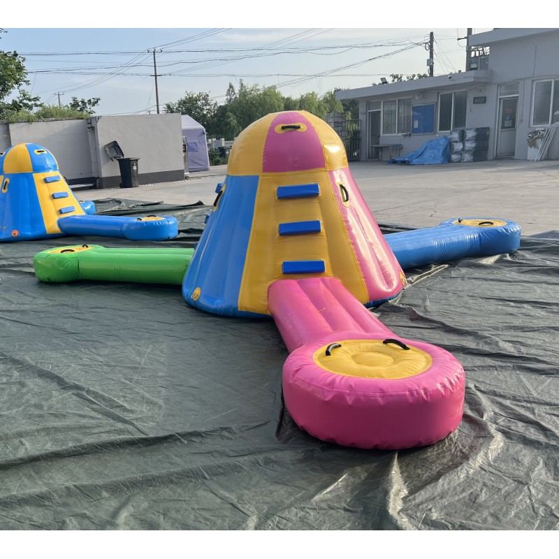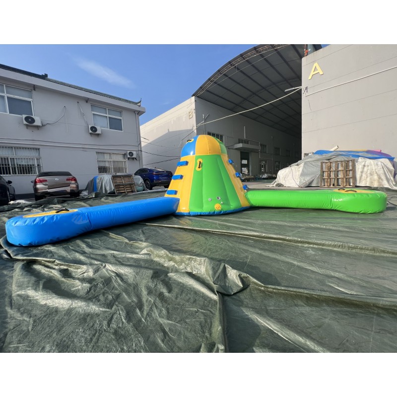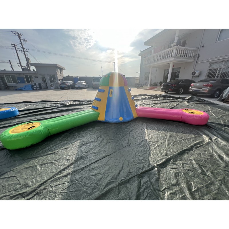 Isla hinchable con tres patas, zona de escalada y rebote.
