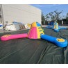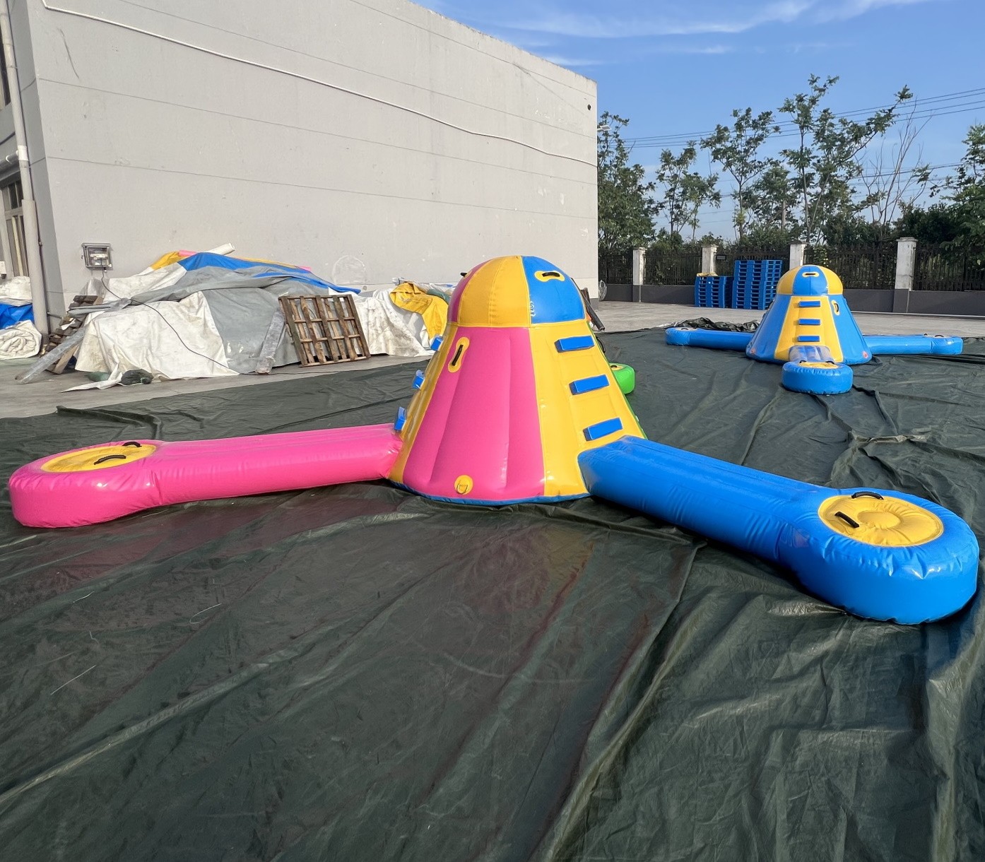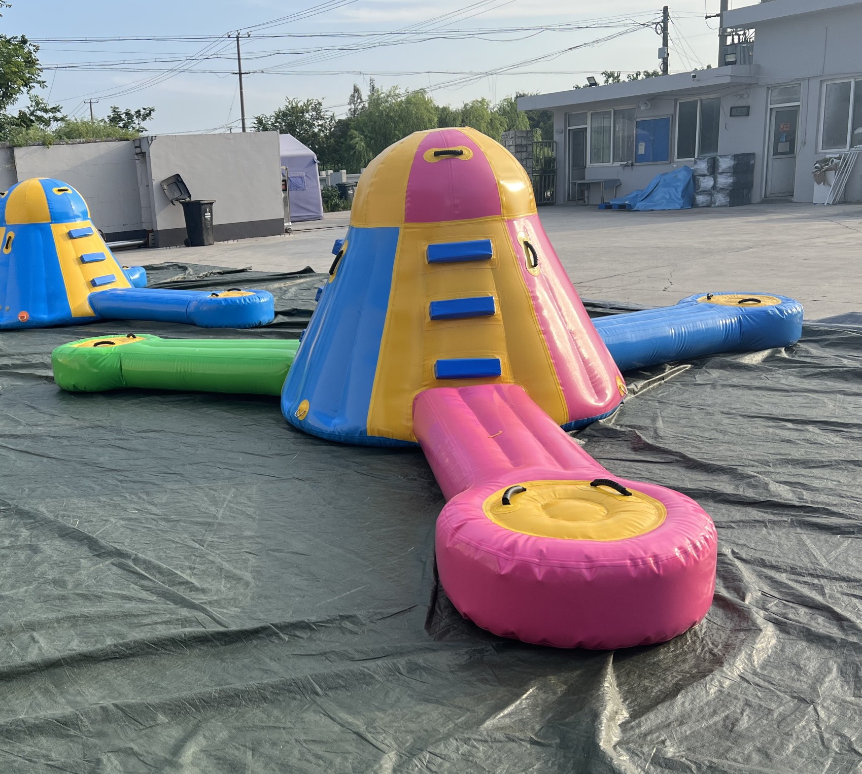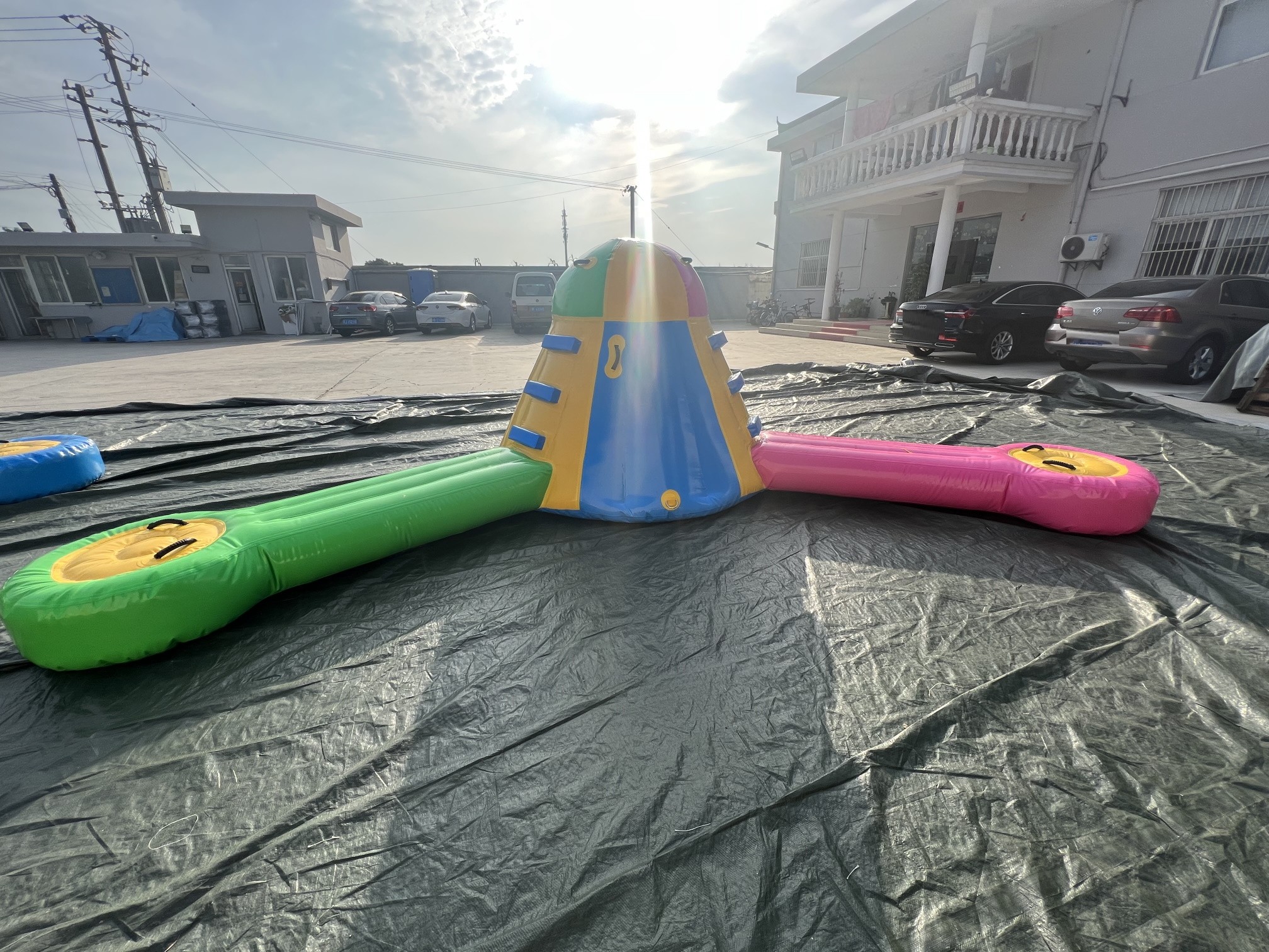 Isla hinchable con tres patas, zona de escalada y rebote.