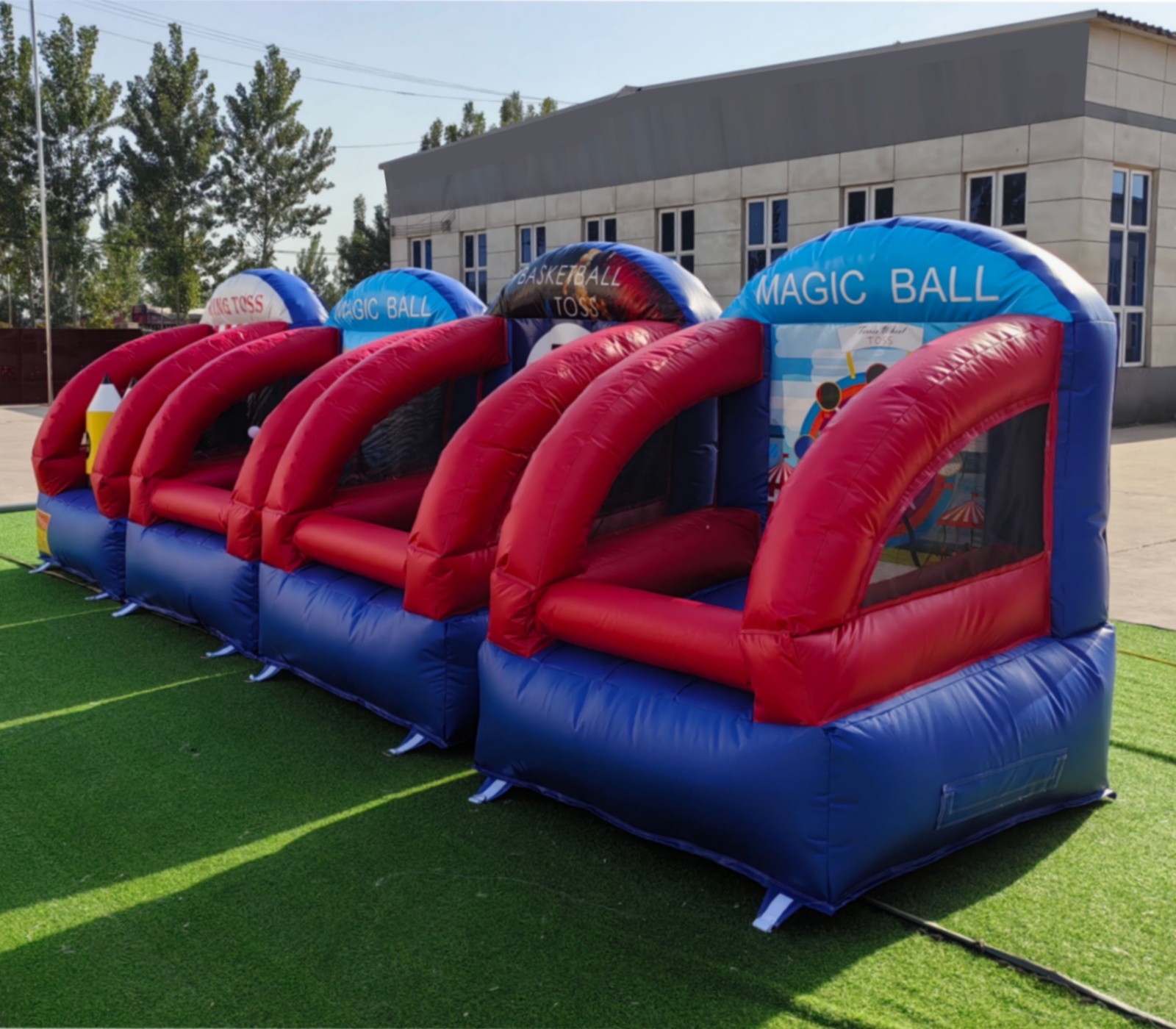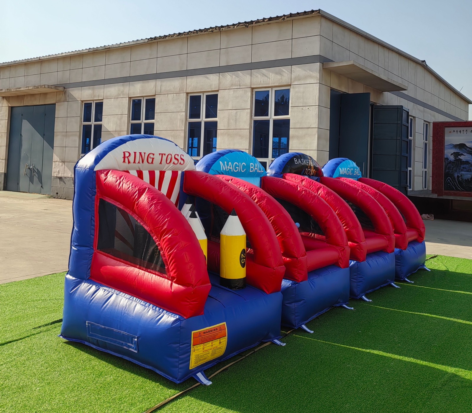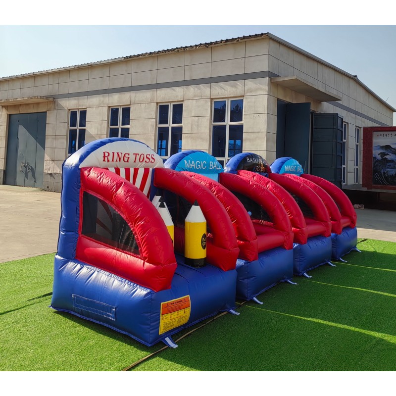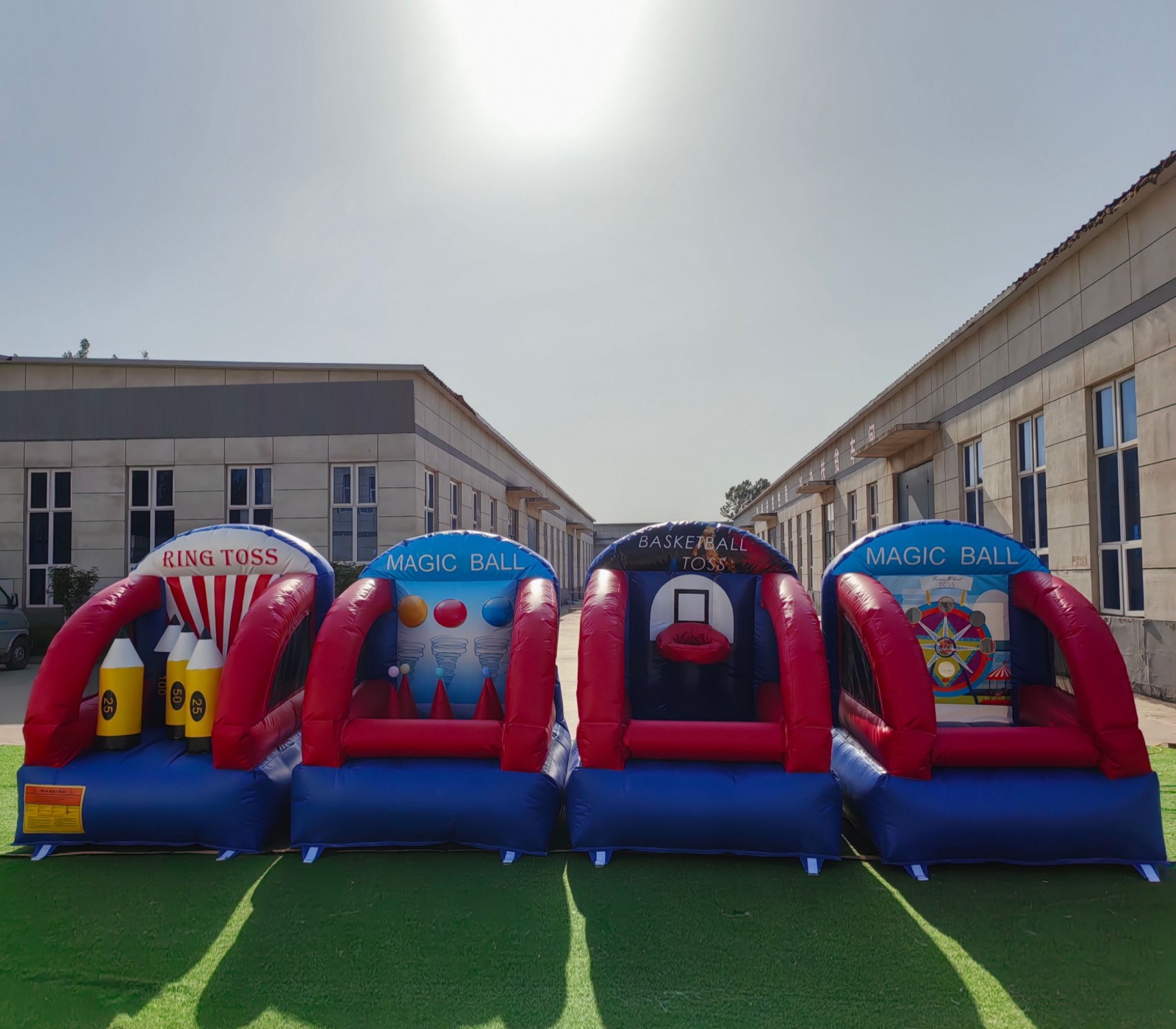 Puestos de feria hinchables, es un juego de carnaval 4 en 1, colección de cuatro juegos de entretenimiento diferentes, especialmente utilizados en un evento de carnaval, celebración o fiesta. Estos juegos pueden proporcionar diferentes desafíos y diversión, adecuados para participantes de todas las edades.