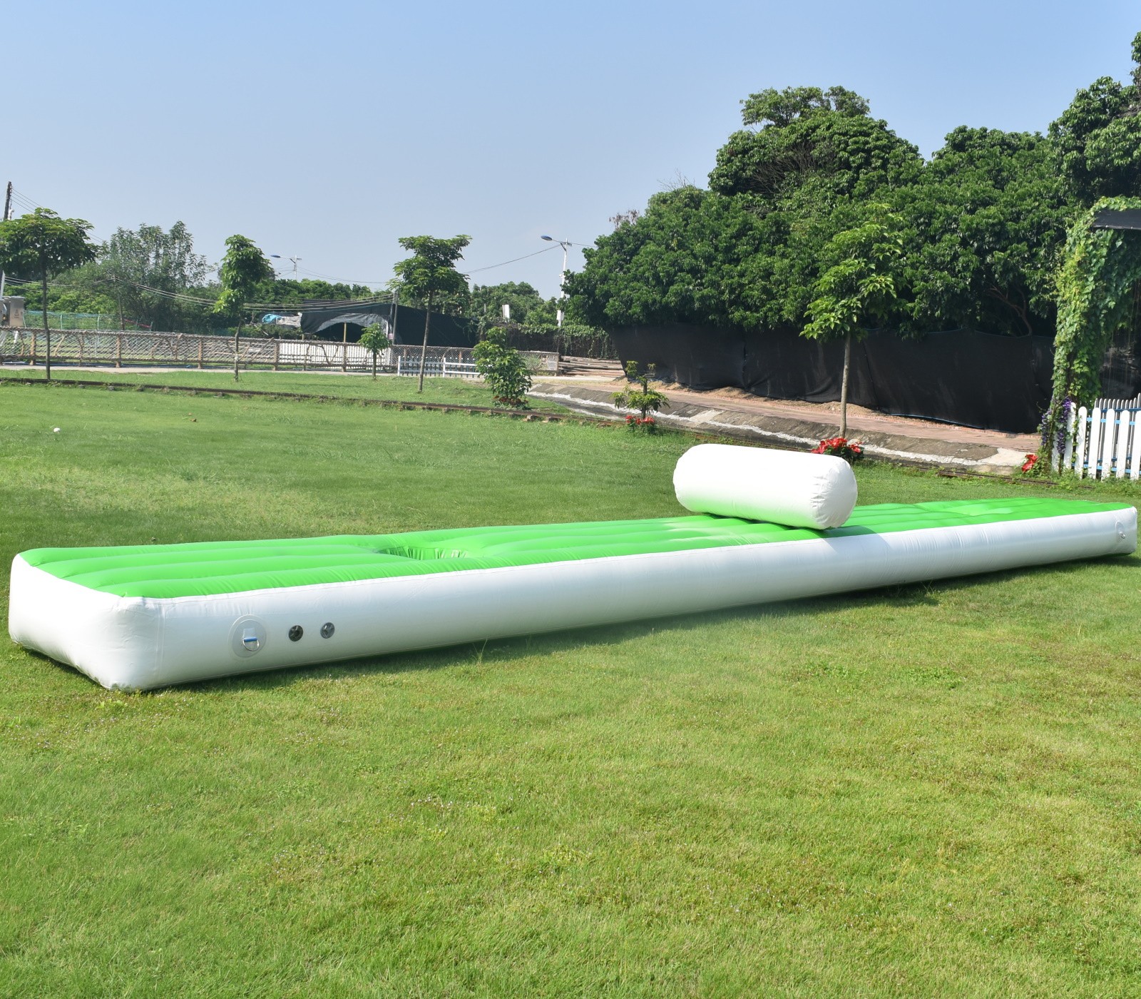 Tiene puntos de amarre en los laterales que permiten fijar en una zona de la piscina creando el recorrido deseado, puede utilizarse individualmente o en conjunto con otros obstáculos hinchables, camas elásticas, círculos hinchables, toboganes, etc.