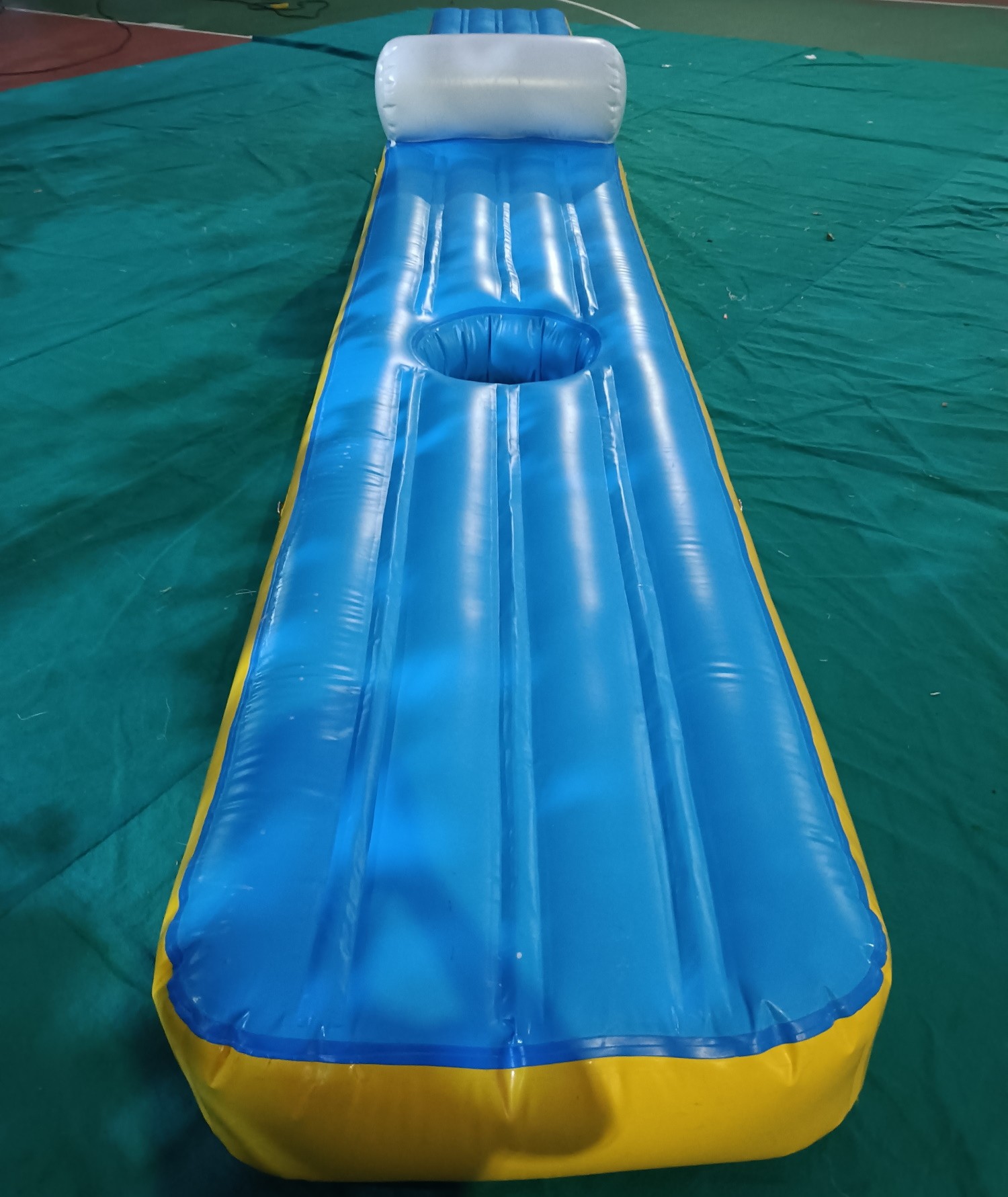 Pasarela hinchable recta con obstaculos de salto y orificios de caída, divertido juego de carreras sobre el agua, caminar o correr y superar todos los obstáculos sin caerse.