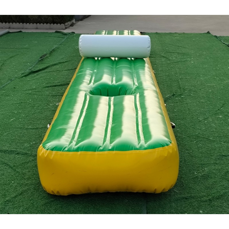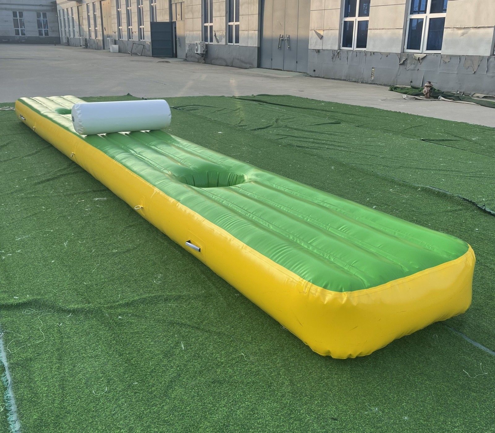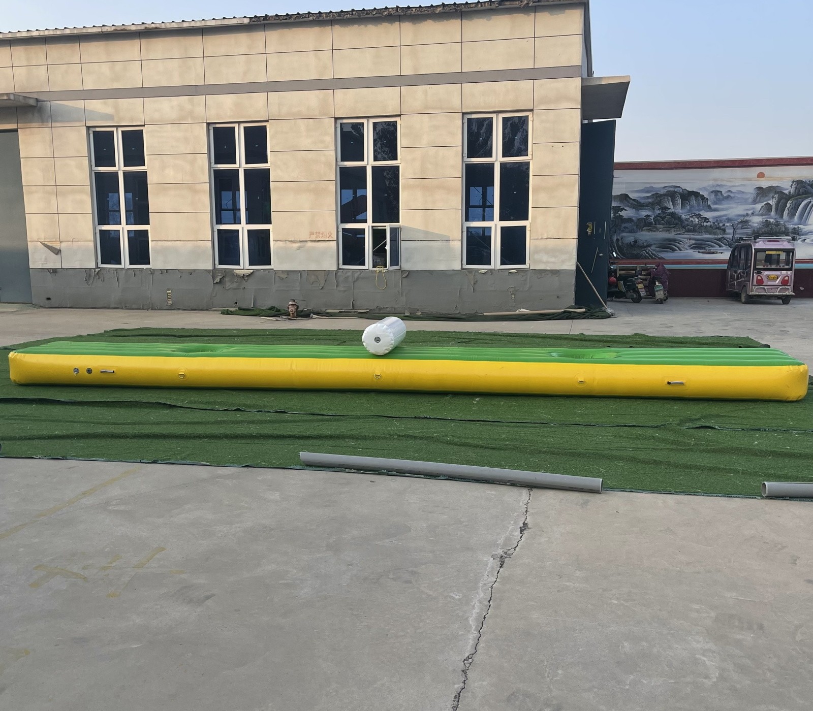 Pasarela hinchable recta con obstaculos de salto y orificios de caída, divertido juego de carreras sobre el agua, caminar o correr y superar todos los obstáculos sin caerse.