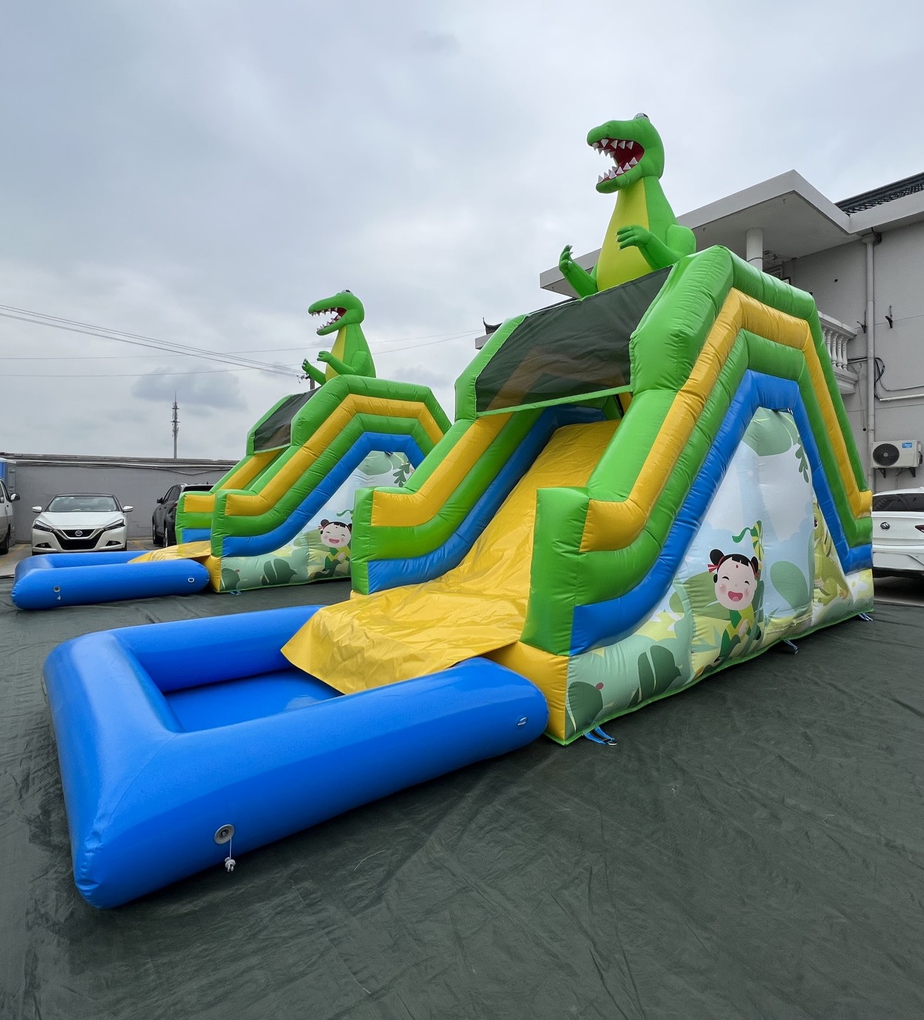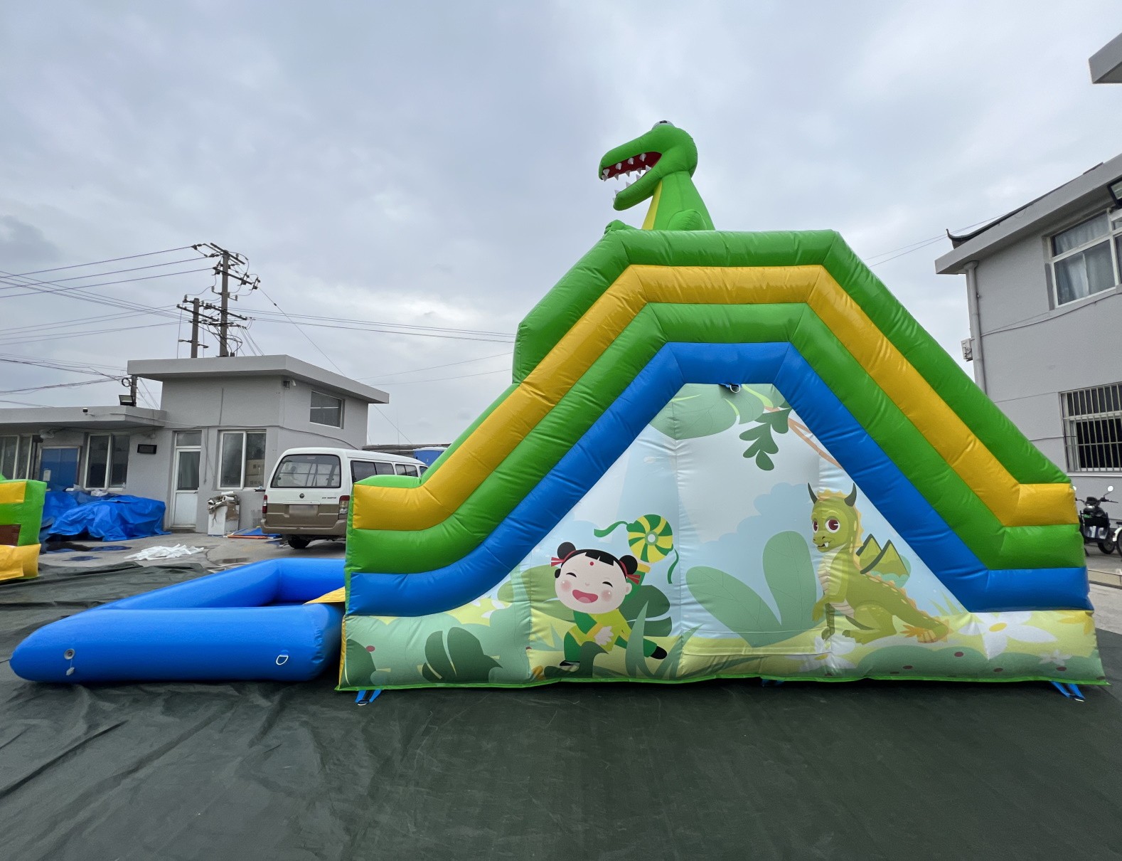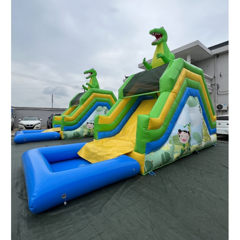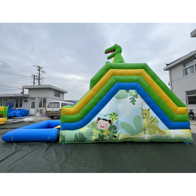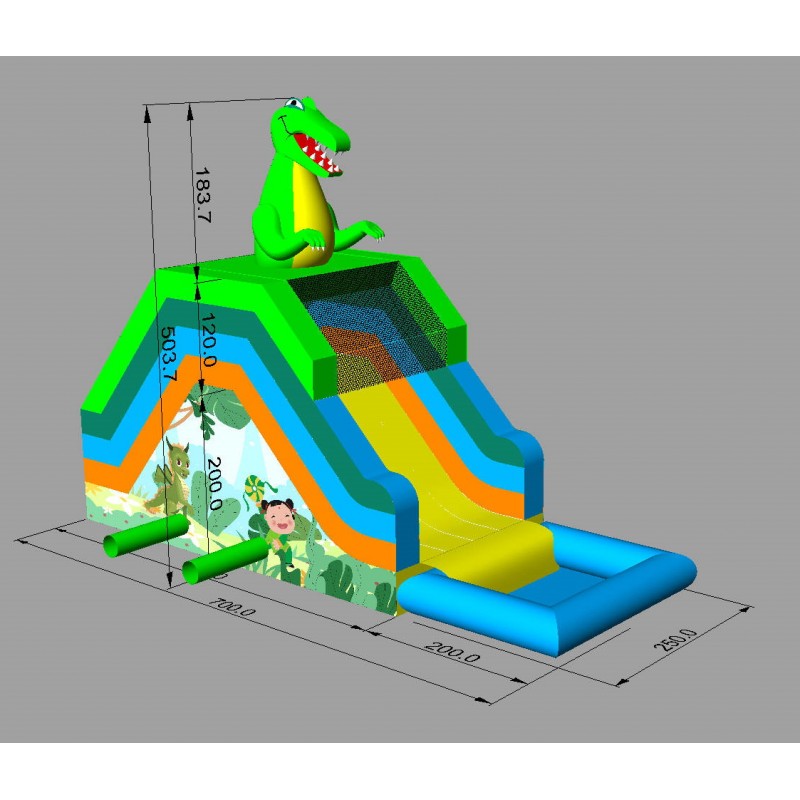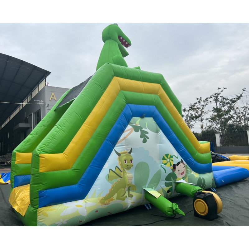 Tobogán hinchable acuático muy colorido con serigrafía de alta calidad con dibujos animados realizados sobre el PVC y un dinosaurio coronando la parte alta del hinchable.