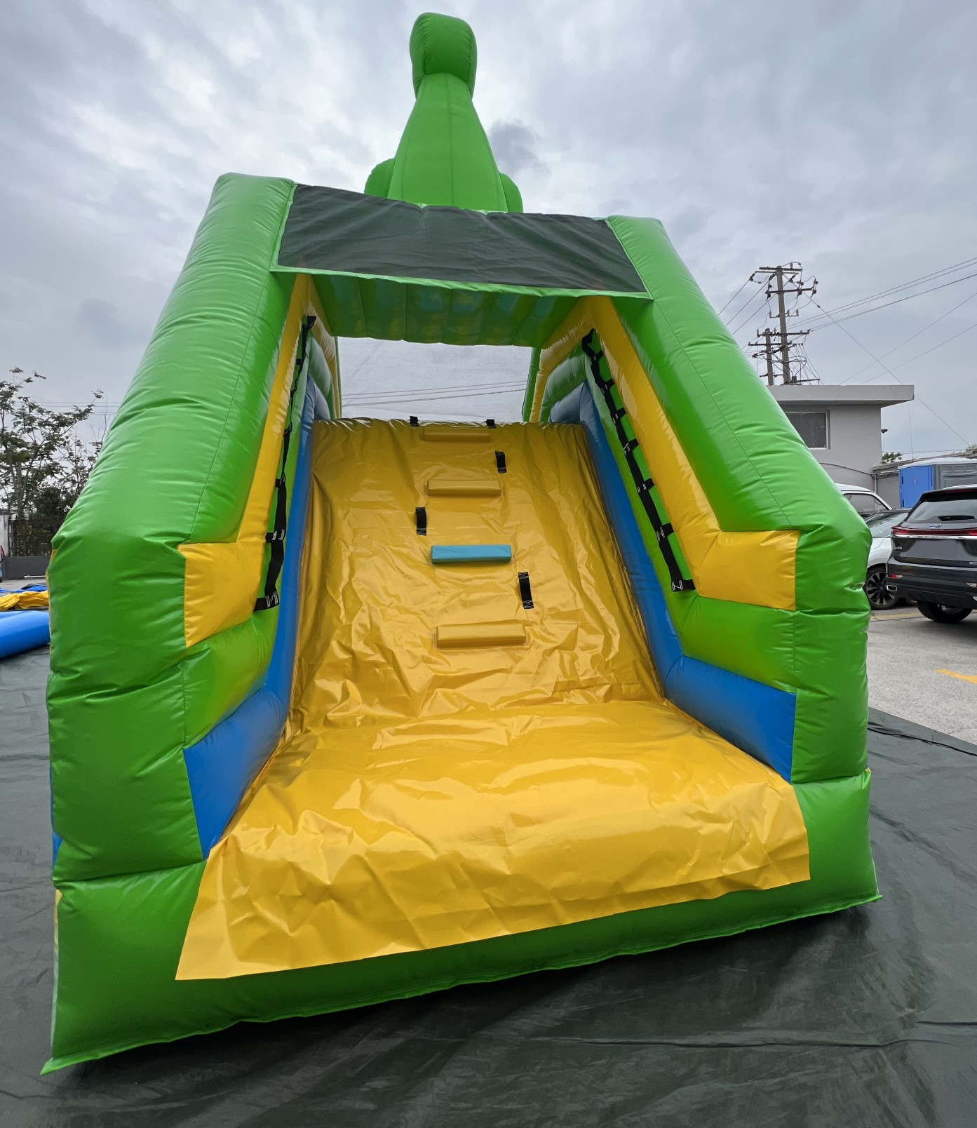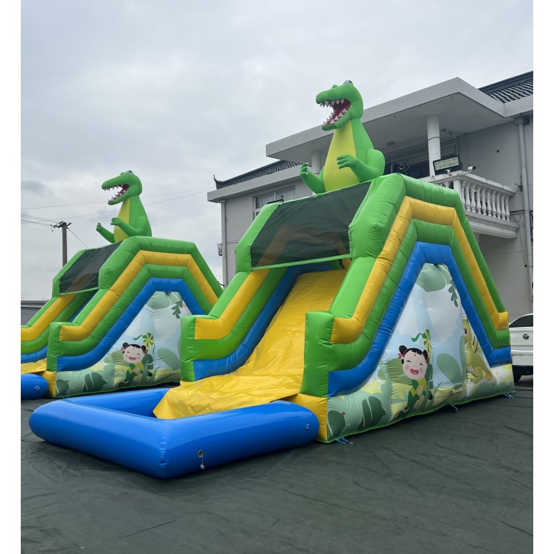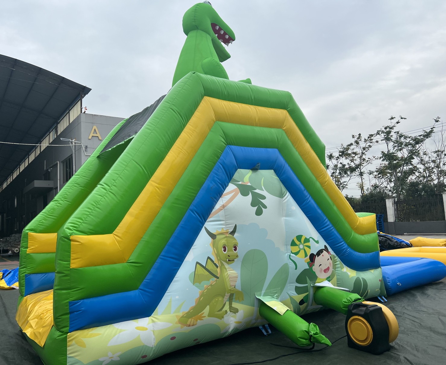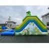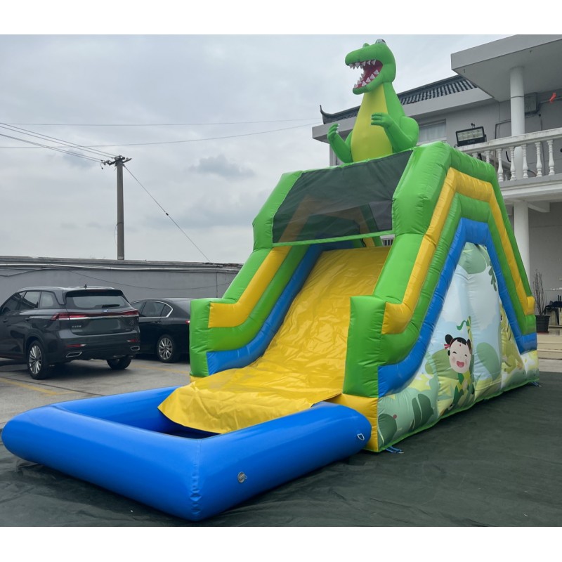 Tobogán hinchable acuático muy colorido con serigrafía de alta calidad con dibujos animados realizados sobre el PVC y un dinosaurio coronando la parte alta del hinchable.