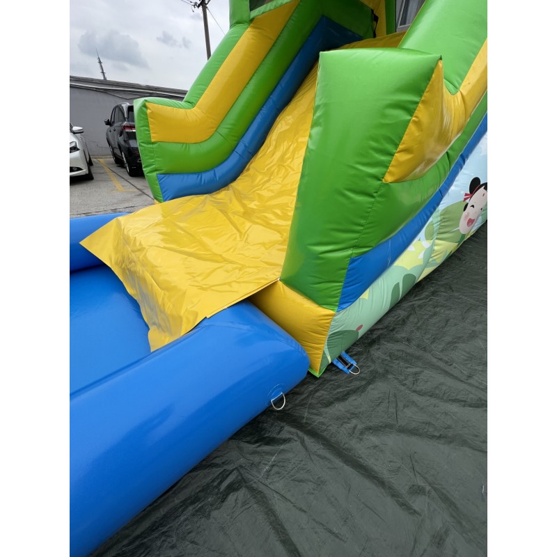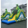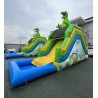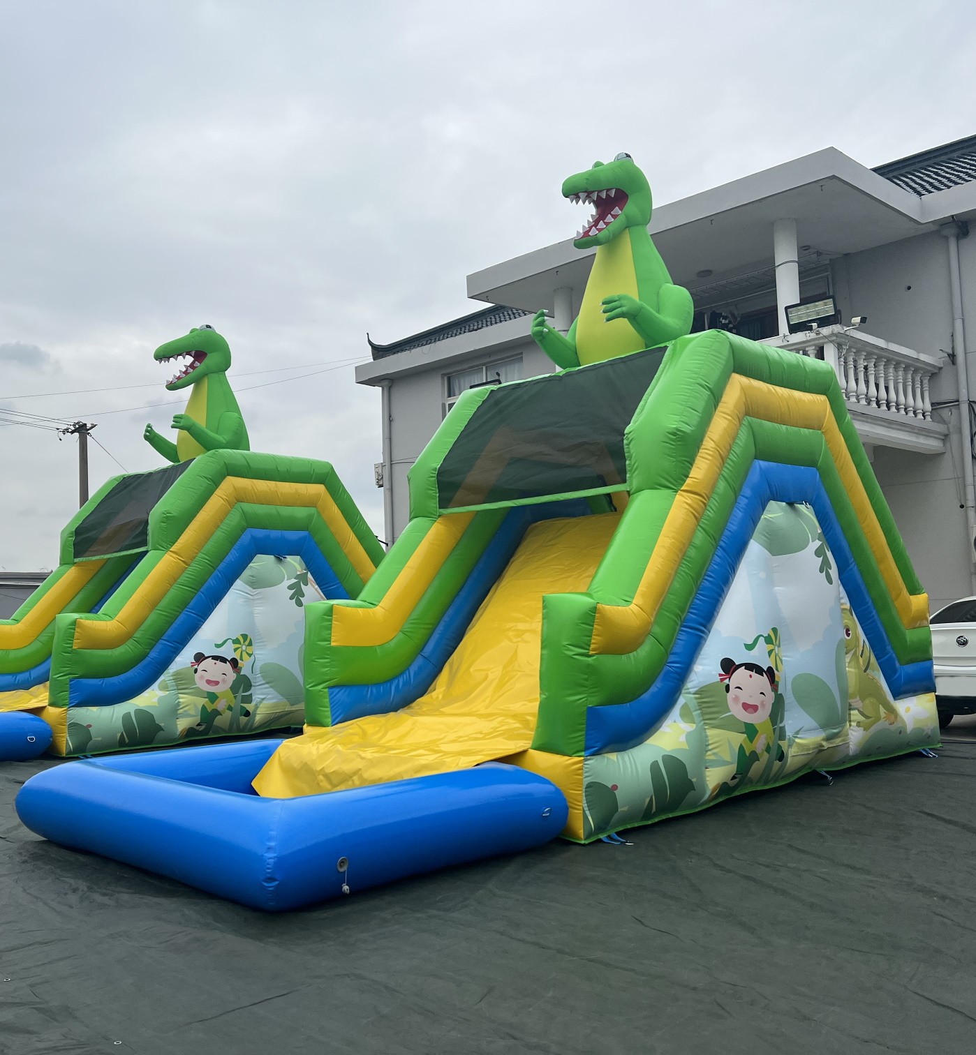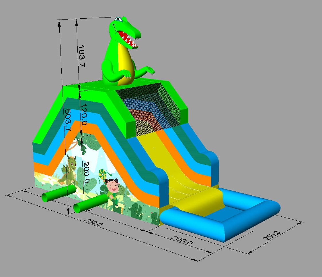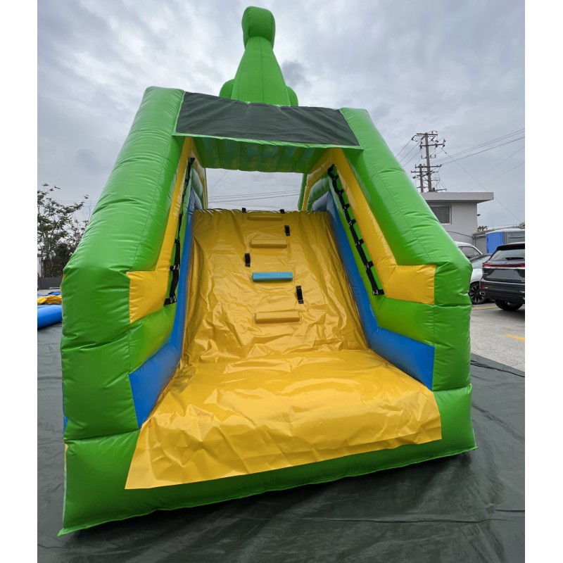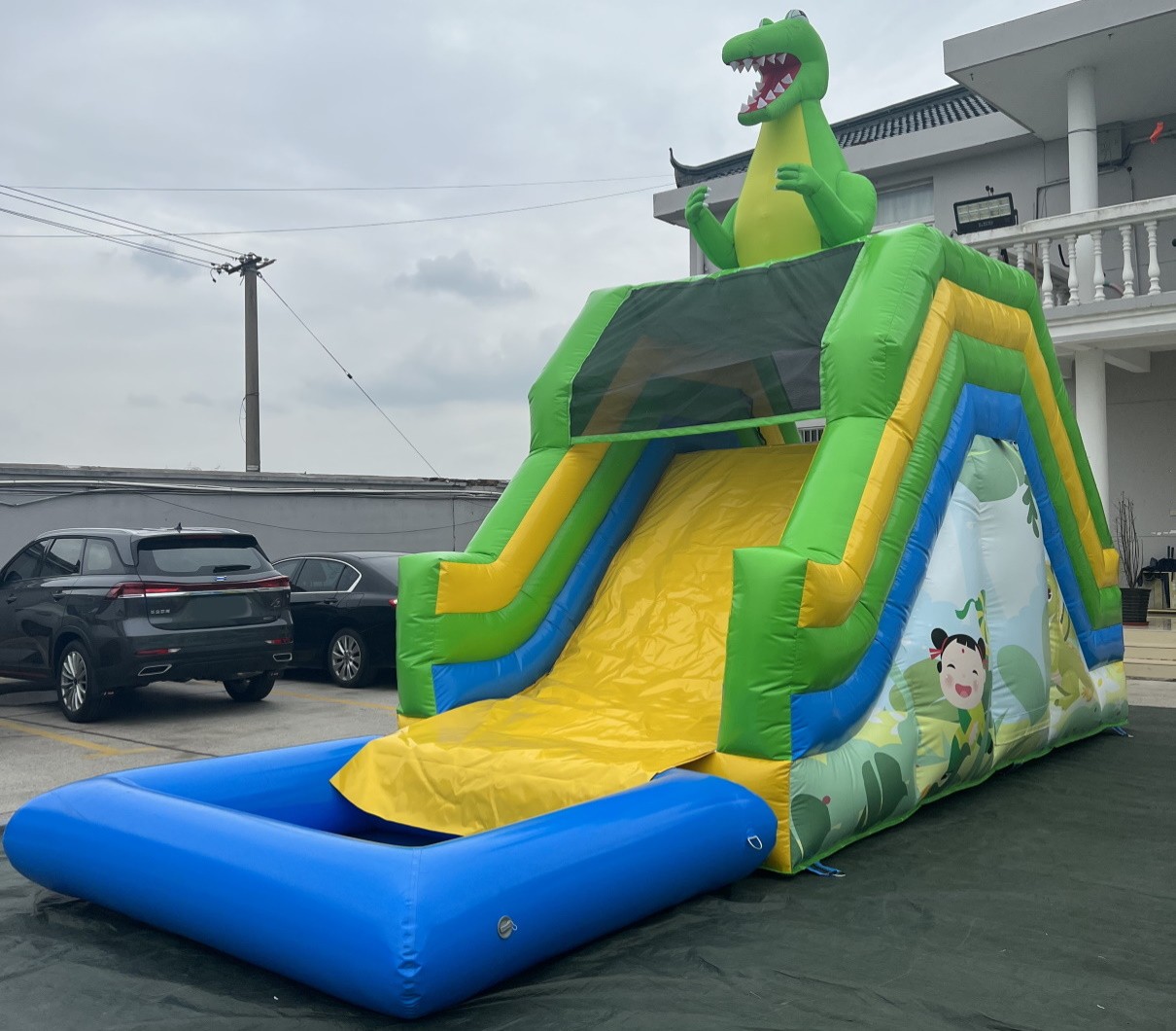 Tobogán hinchable acuático muy colorido con serigrafía de alta calidad con dibujos animados realizados sobre el PVC y un dinosaurio coronando la parte alta del hinchable.