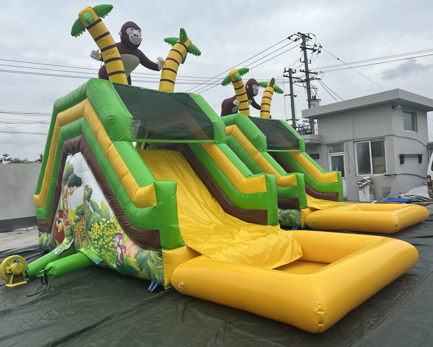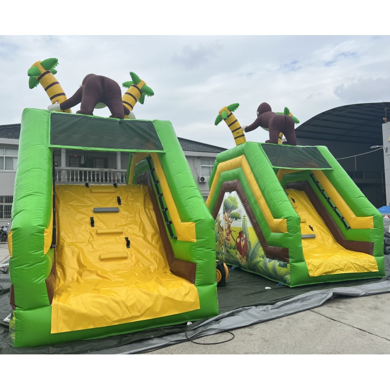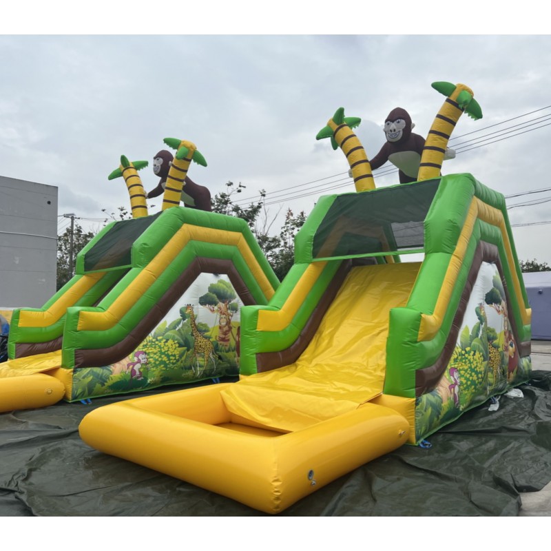 Tobogán hinchable acuático muy colorido con serigrafía de alta calidad con dibujos animados realizados sobre el PVC y un gran gorila en la parte alta del hinchable.