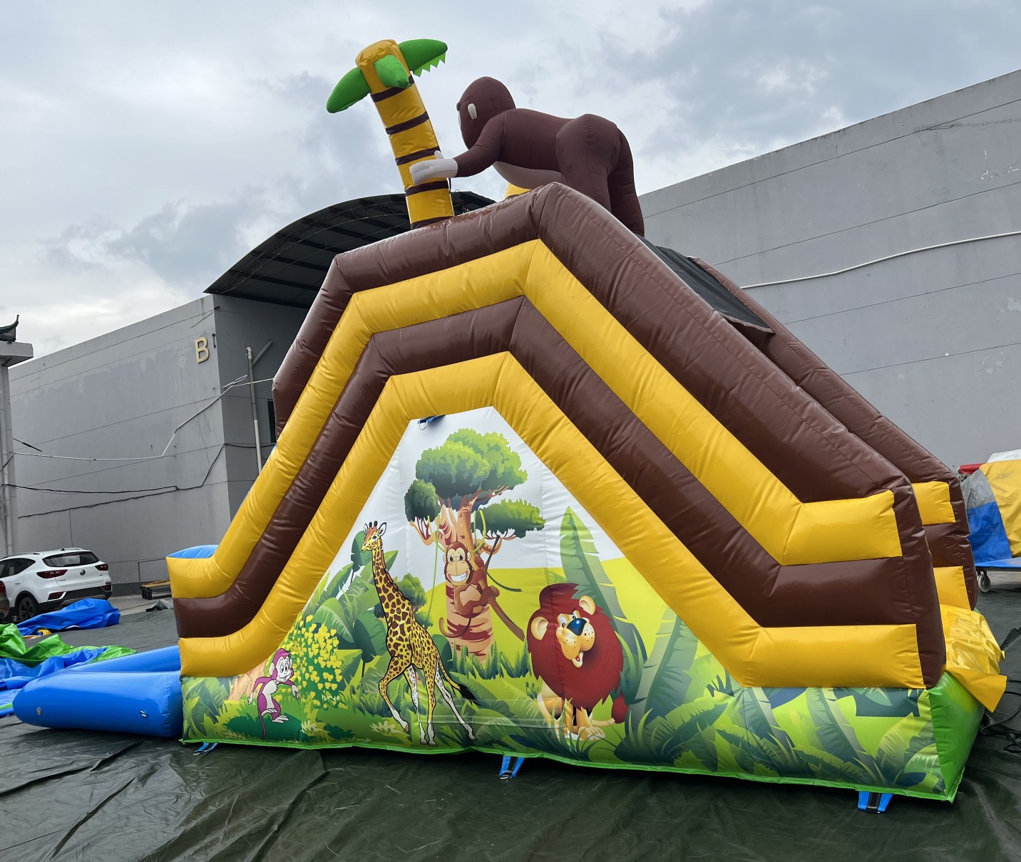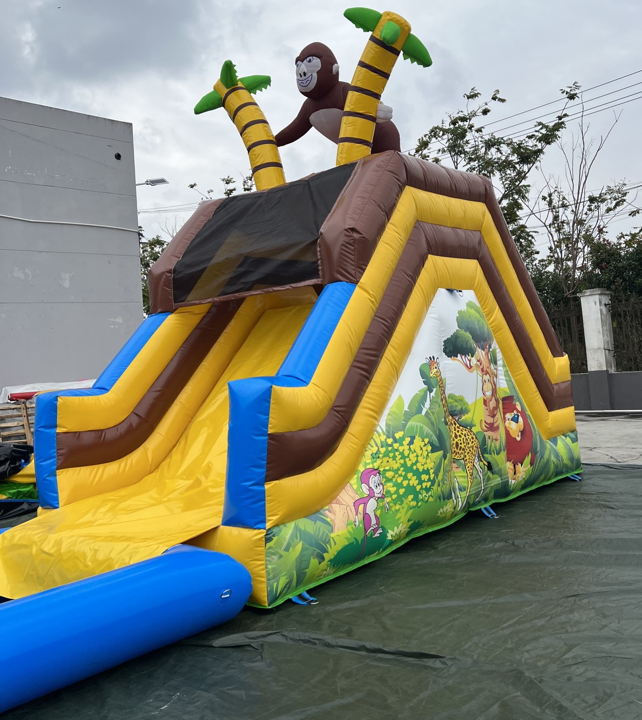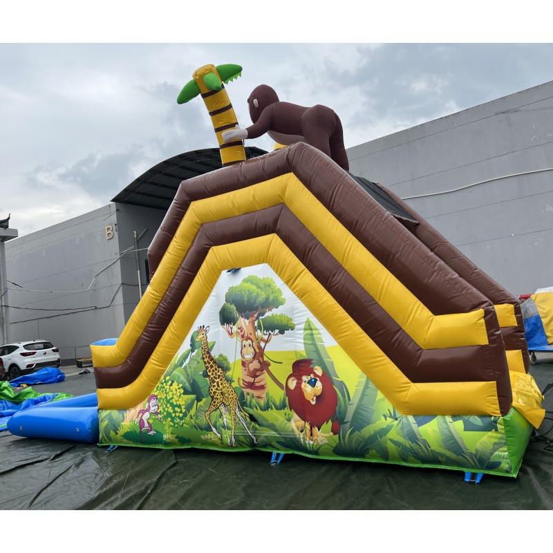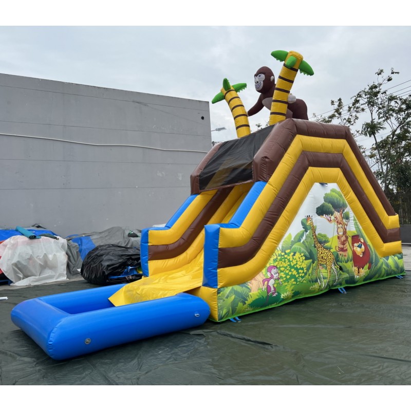 Tobogán hinchable acuático muy colorido con serigrafía de alta calidad con dibujos animados realizados sobre el PVC y un gran gorila en la parte alta del hinchable.