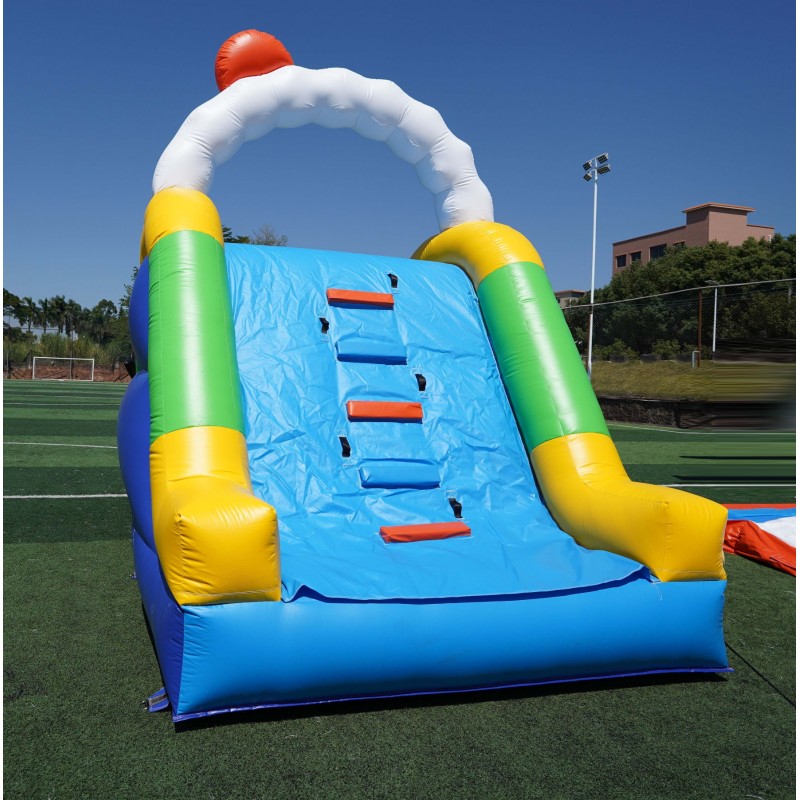 El tobogán incluye una funda de PVC con tratamiento deslizante que favorece altamente el deslizamiento de los usuarios. La funda de la escalera y del tobogán pueden desmontarse con velcro, esto facilita las labores de limpieza y secado del hinchable para su correcta conservación y prevención de la humedad. Los laterales del tobogán también están recubiertos por una funda desmontable que permite canalizar mejor el agua y garantizar aún más la impermeabilidad del hinchable.