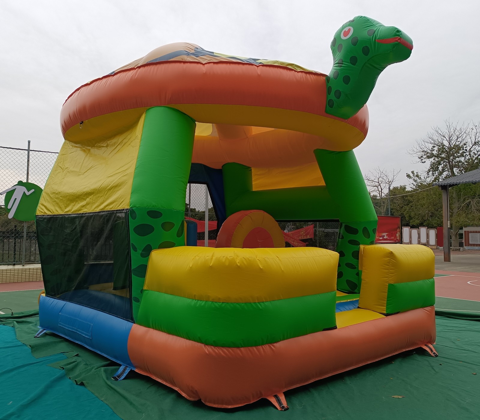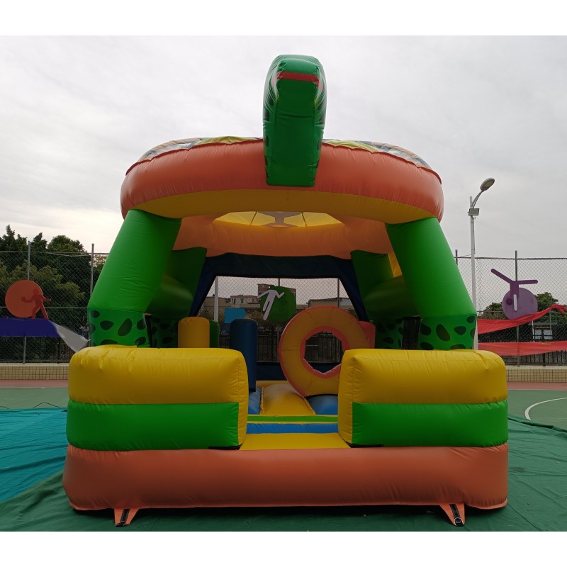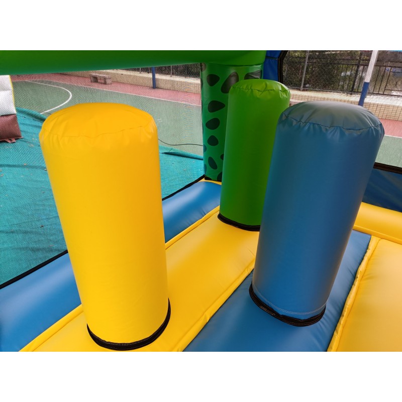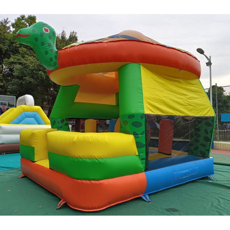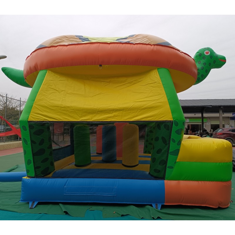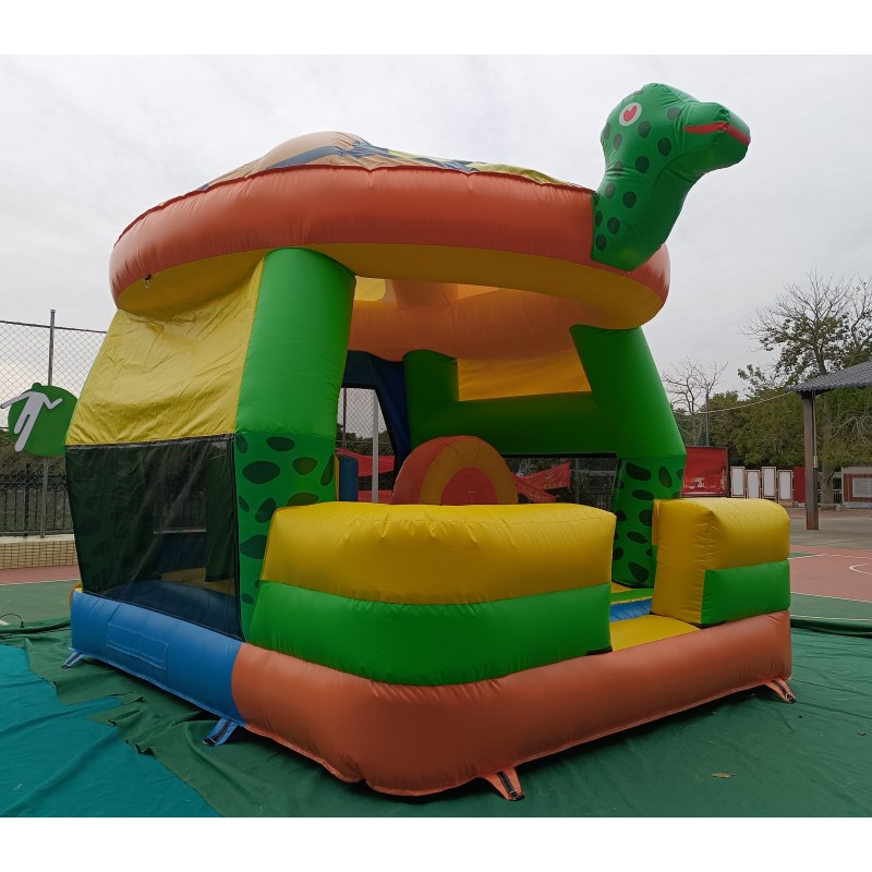 El hinchable simula a una gran tortuga con un gran caparazón de techo, cabeza y cola en 3d. El resto del hinchable está serigrafiado con impresiones de gran calidad sobre el PVC.