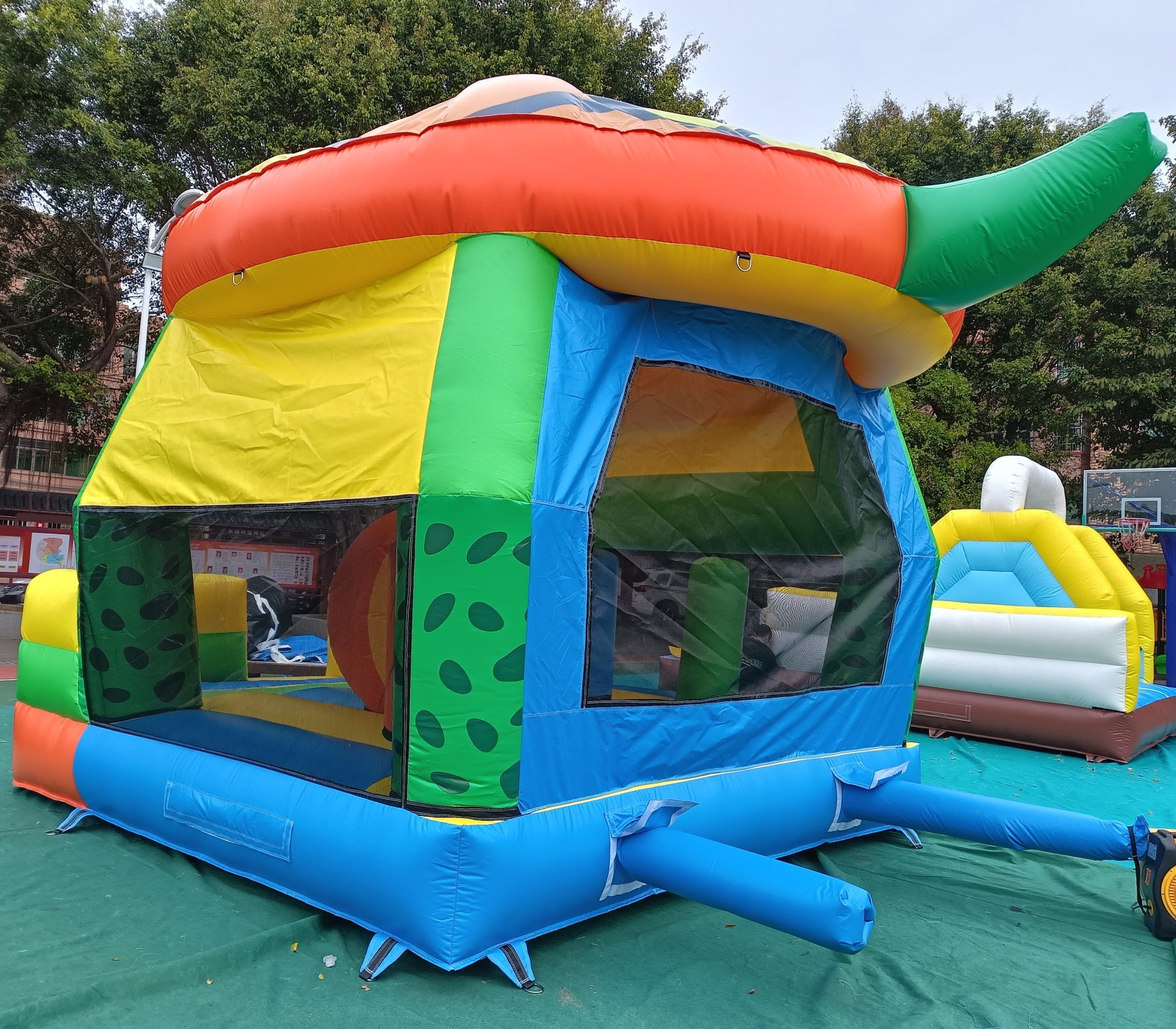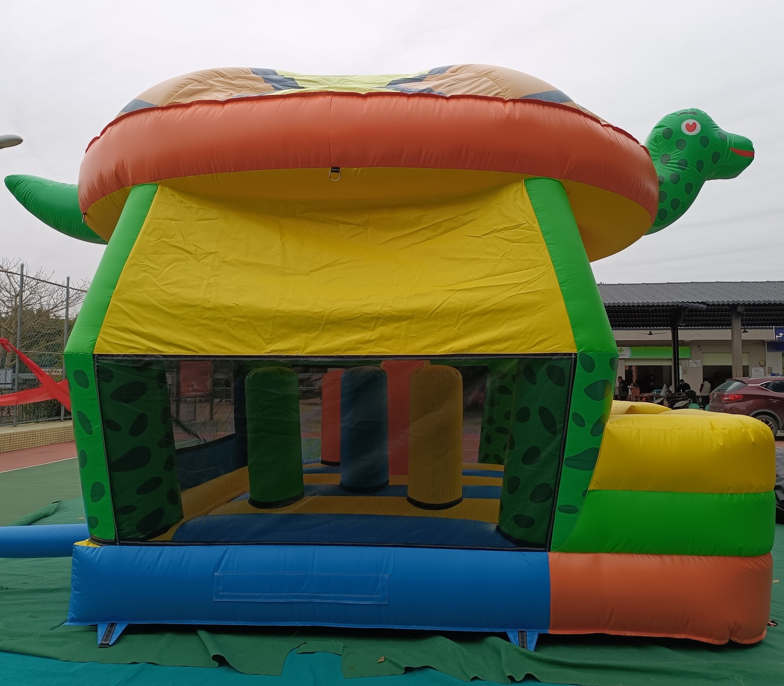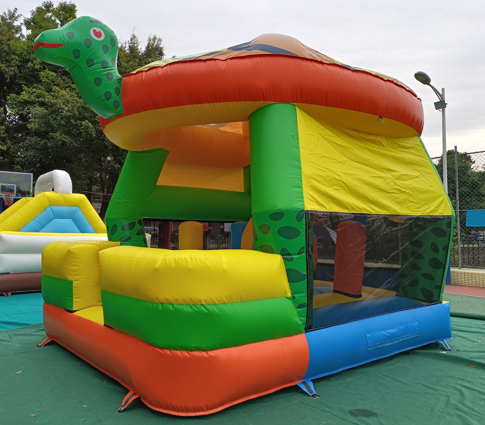 El hinchable simula a una gran tortuga con un gran caparazón de techo, cabeza y cola en 3d. El resto del hinchable está serigrafiado con impresiones de gran calidad sobre el PVC.
