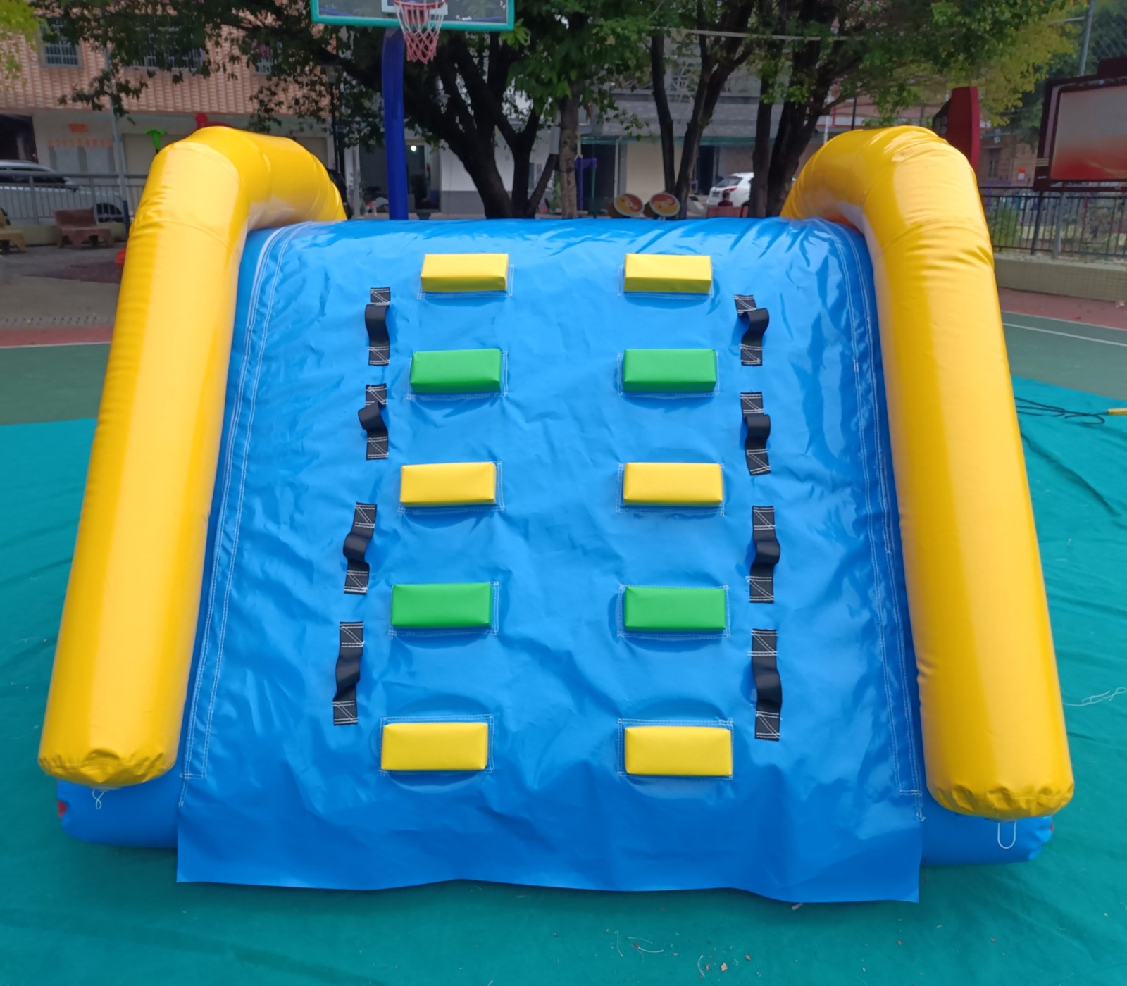 El tobogán incluye una funda de PVC con tratamiento deslizante, esto mejora considerablemente el deslizamiento de los usuarios.La funda es impermeable y desmontable con velcro, esto permite realizar una mejor limpieza, secado del hinchable y una mejor prevención de la humedad.